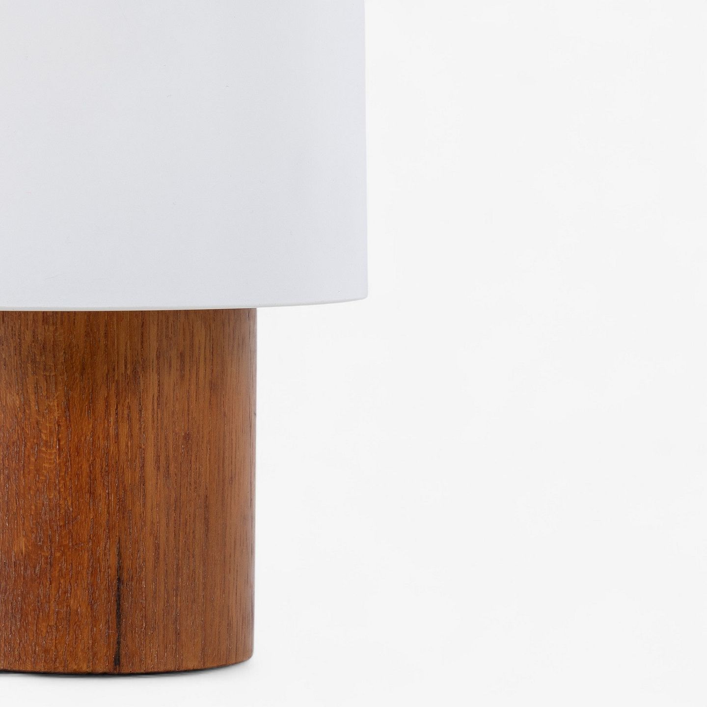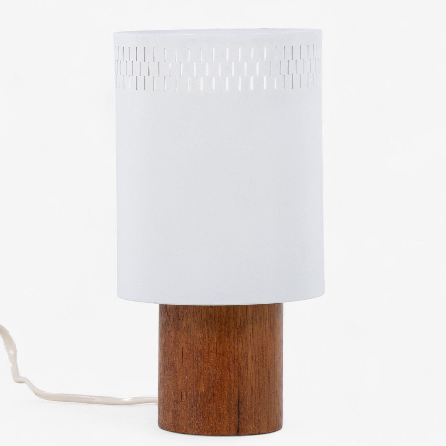 Cylindrisk formet bordlampe med base i patineret teak og skærm i hvidlakeret metal.