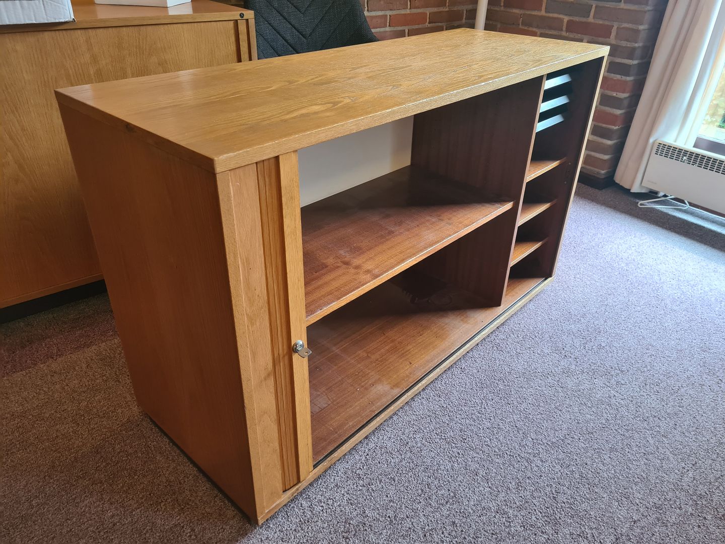 Arkivskab fra 1980'erne i finéret eg med jalousi låge. Fremstår pænt og velholdt, dog med lettere brugsspor på toppen. (Billeder) Forskellige indretningsformer haves. Fungerende nøgle medfølger.