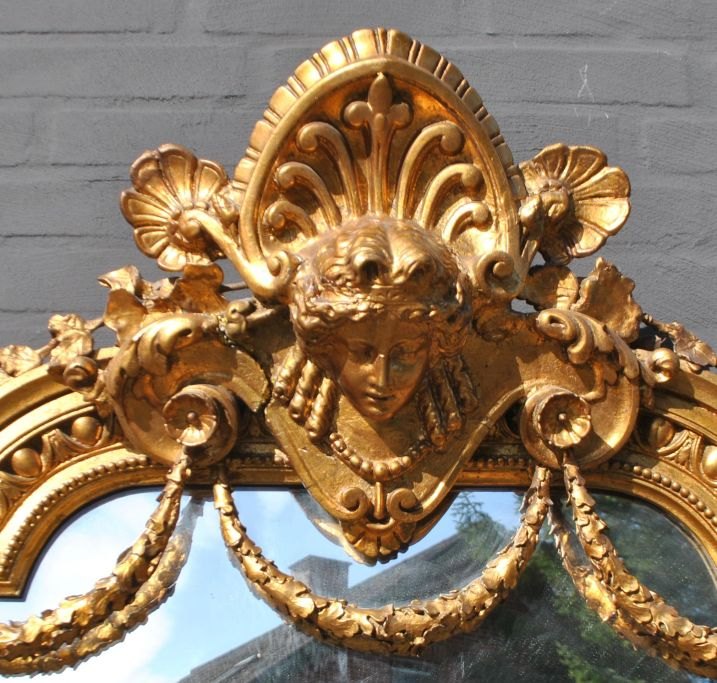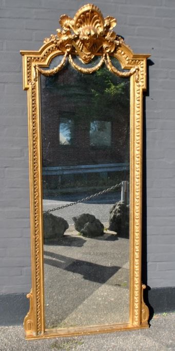 Stort dansk antikt forgyldt spejl, ca. 1870. Med kantdekorationer. Øverst ranker og kvindeansigt.  H.: 220 cm. B.: 85 cm.
