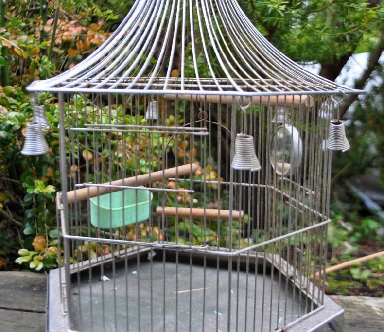 Sekskantet fuglebur i metal, tidlig 20. årh. Med en låge, to skydedøre, to træpinde, spejl, gynge og madtrug. Bund kan trækkes ud som skuffe til rengøring. Inkl. krog til ophængning. H: 45 cm. B: 34 cm.
