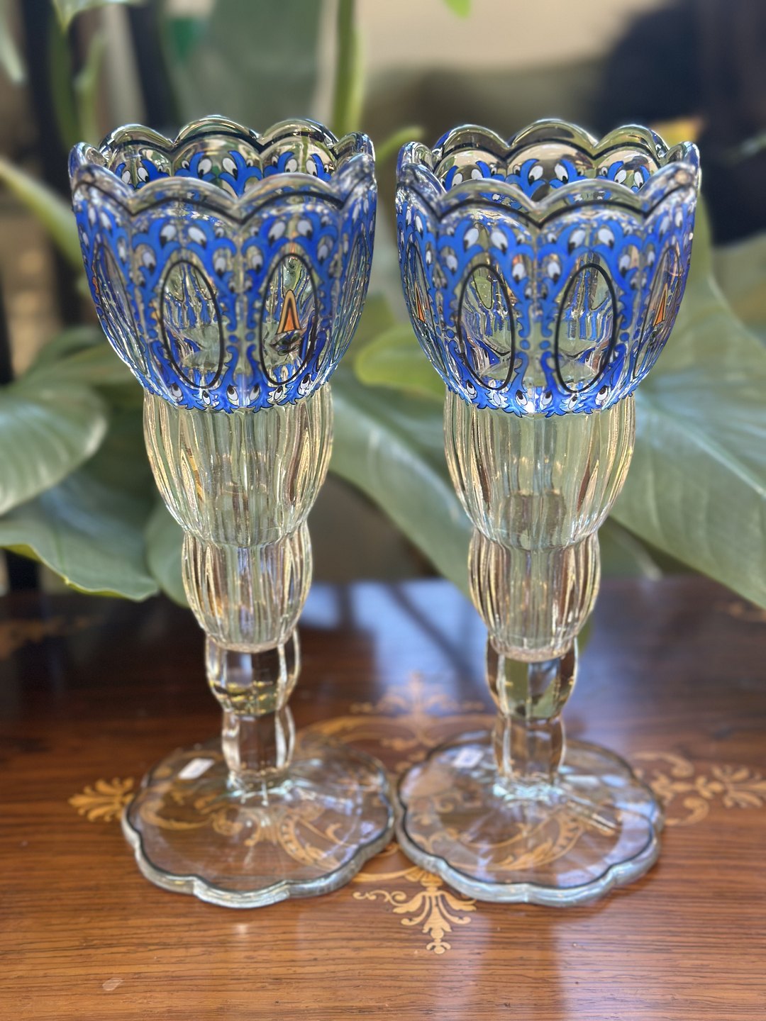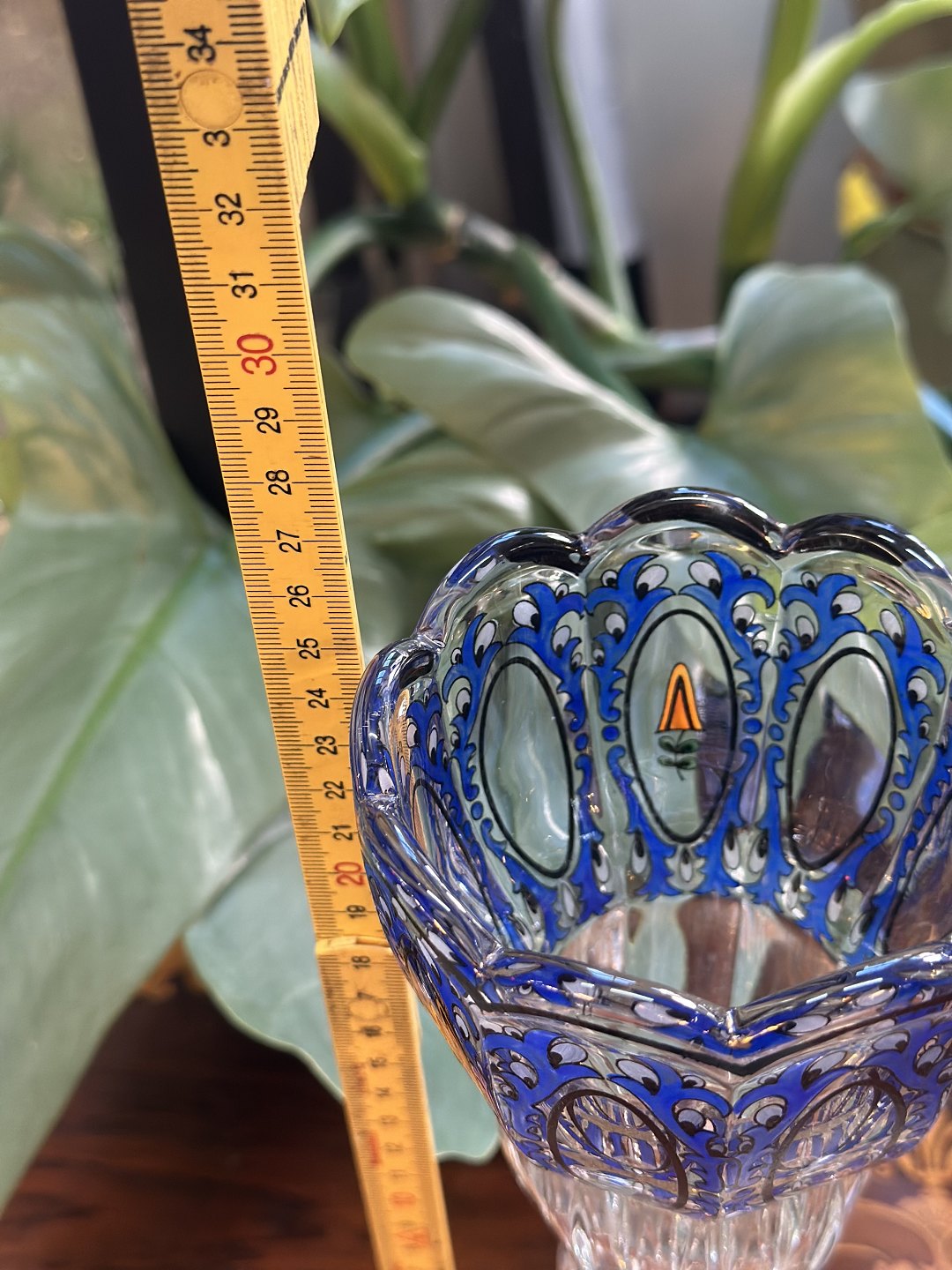 Bohemia krystalvase overfang vase i kobaltblåt glas , slebet dekoreret med guld og emaljemaling , fra Ca 1950 -1970 tallet .