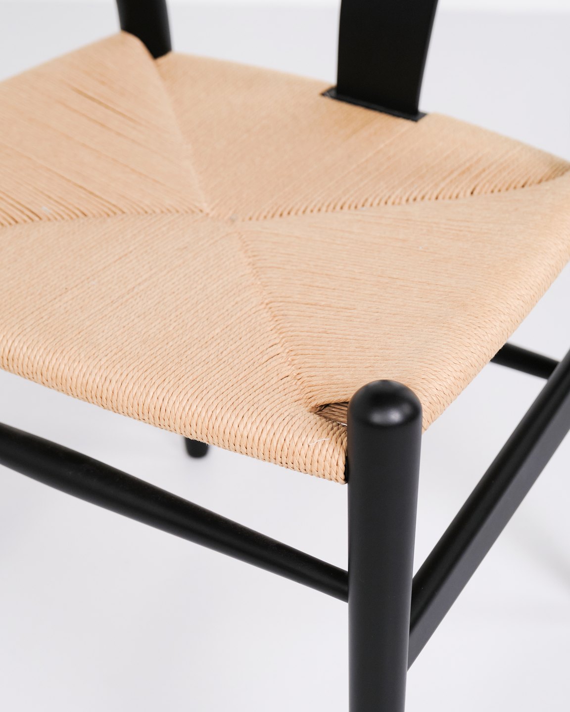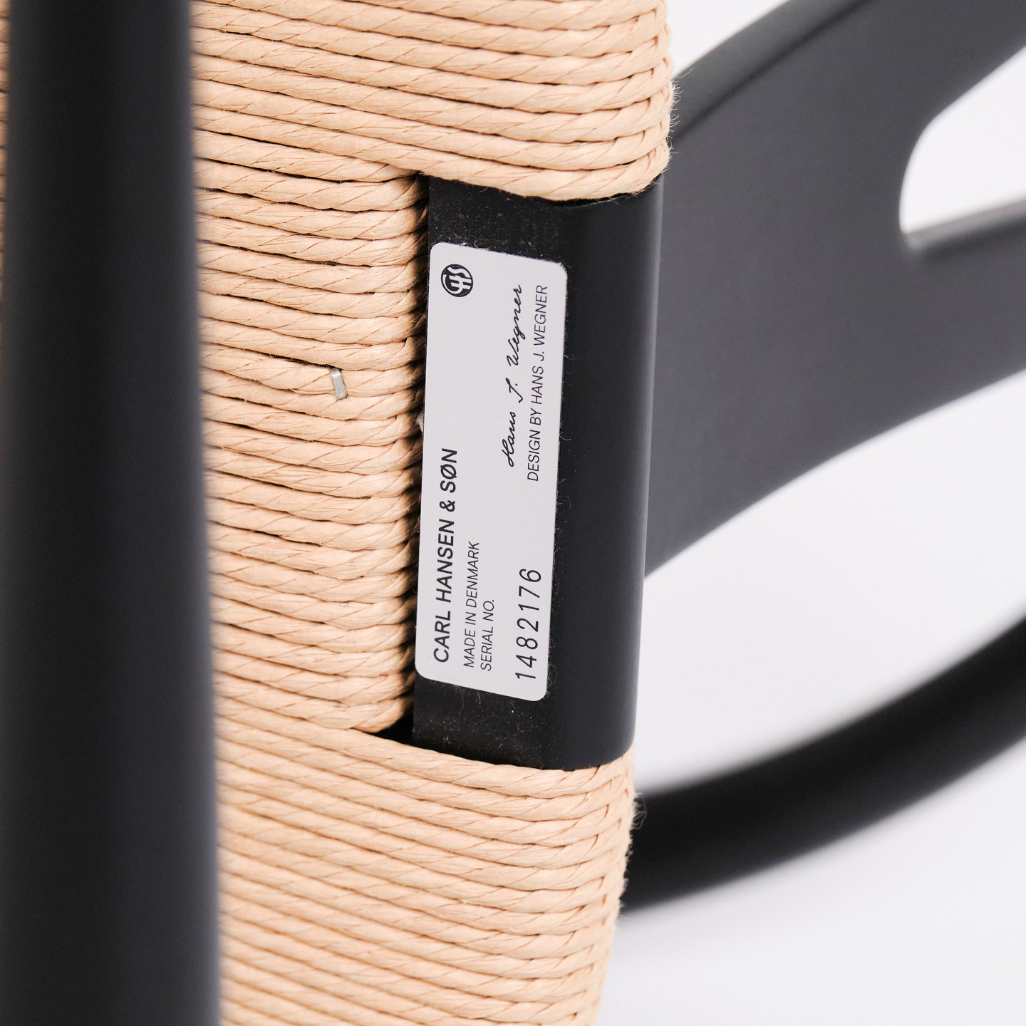 Sæt af fire Y-stole, model CH24, designet af Hans J. Wegner og produceret af Carl Hansen & Søn. Stolene er udført i massivt træ, lakeret i Soft Black, og med sæde i flettet naturpapir.