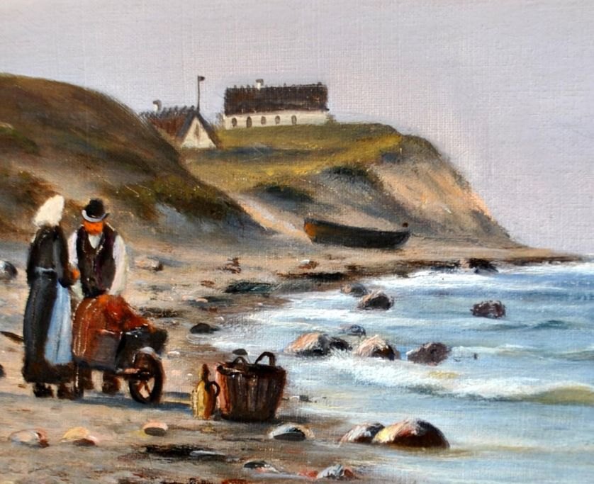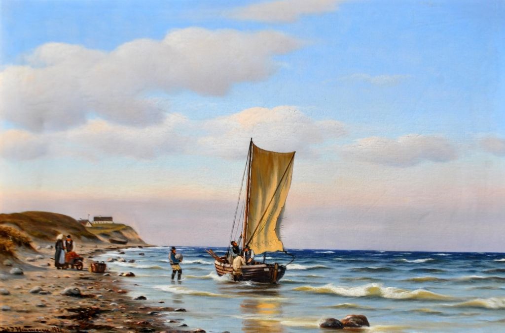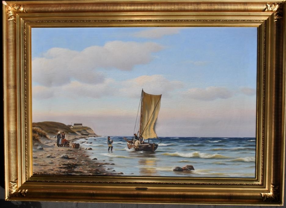 Neumann, Johan (1860 - 1940) Danmark: En fiskerbåd på kysten. Olie på lærred. Signeret 1922. 78 x 101 cm.