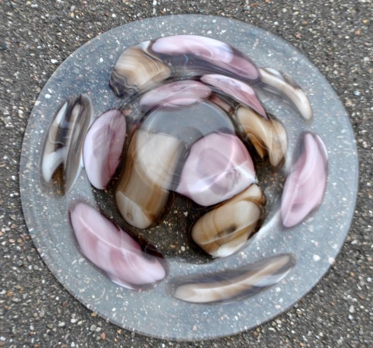 Glasfad med rosa og brun dekoration, 20. årh. Dia: 43 cm. H: 8 cm.