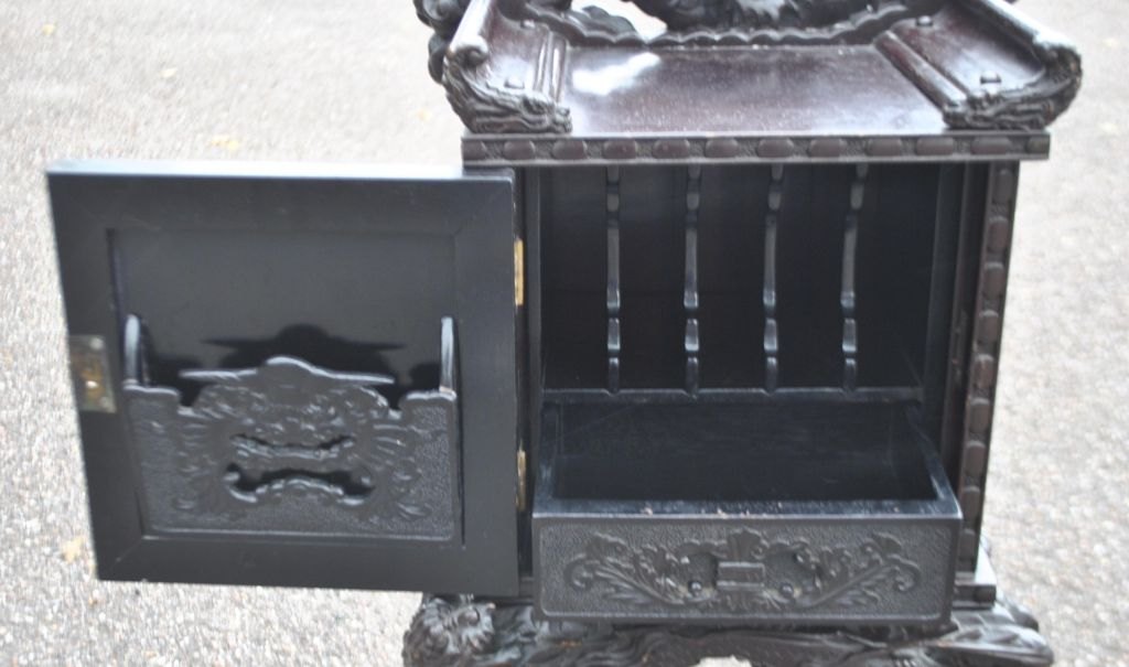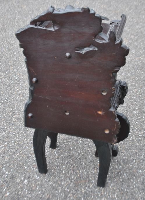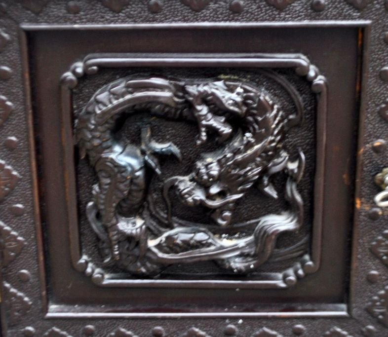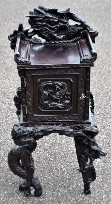 Lille kinesisk skab til breve i hårdt træ, 20. årh. Mørkt træ med mange udskårne drager. Indeni brevordner og skuffe. H: 73 cm. B: 39 cm. D: 28 cm.