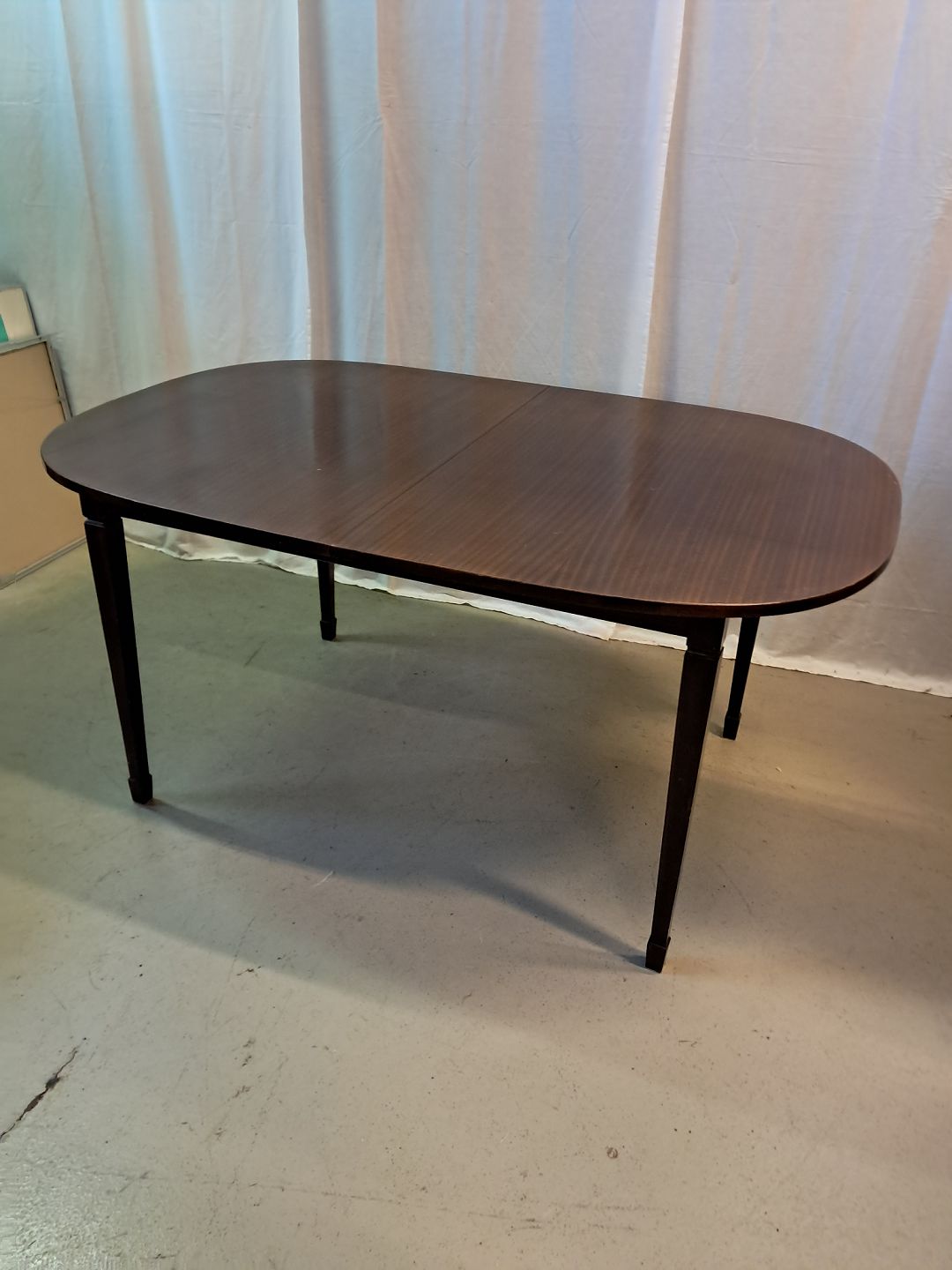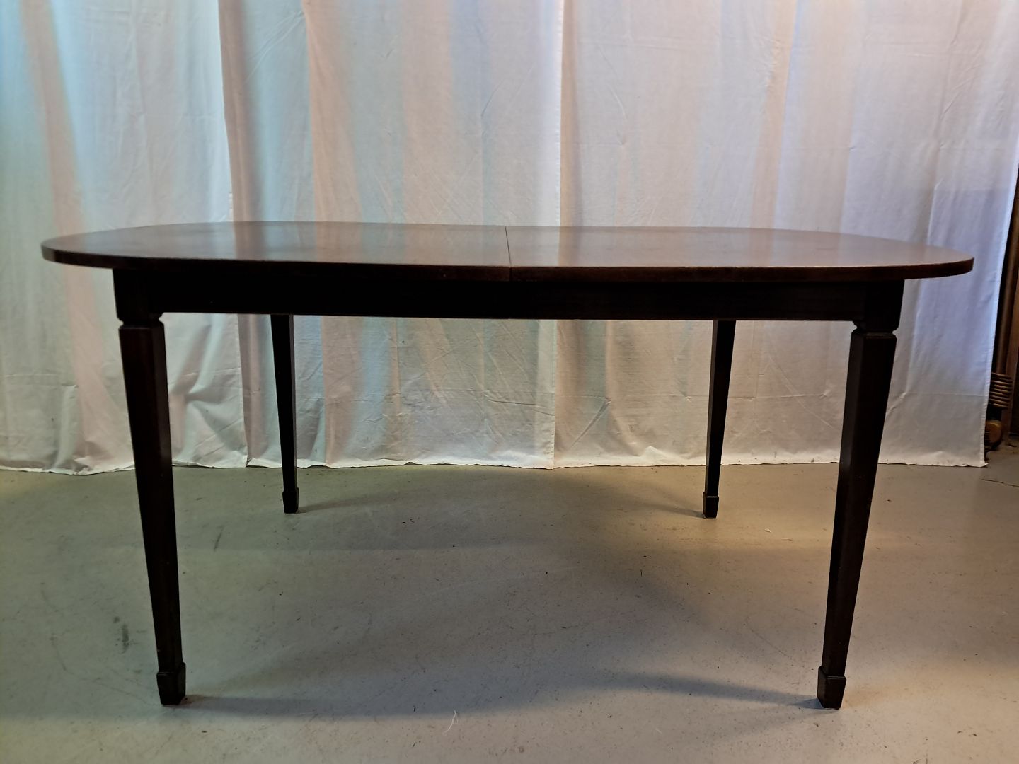 Spisebord i fineret mahogni med 2 tillægsplader, fra 1980erne.