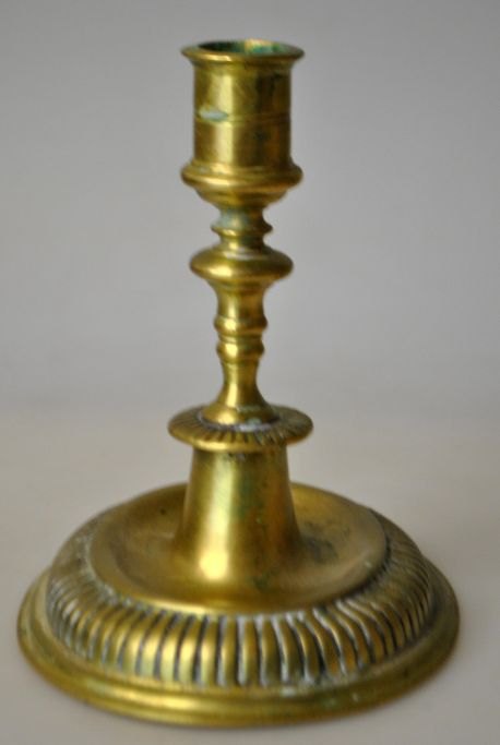 Engelsk barok lysestage i messing, 18. årh. På oval fod med kannelleringer. Drejet stamme. H.: 13 cm. Længde fod.: 12 cm.