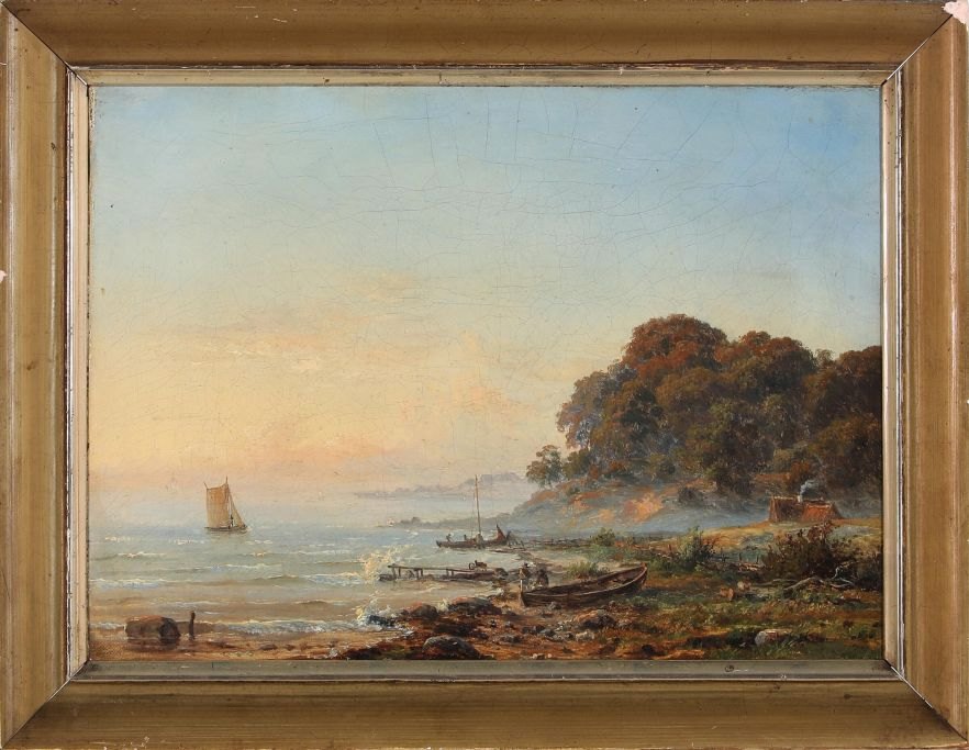 Kiærschou, Frederik Christian (1805 - 1891) Danmark: Fiskerne vender hjem fra havet. Fiskerne vender hjem fra havet. Olie på lærred. Meget svagt signeret.