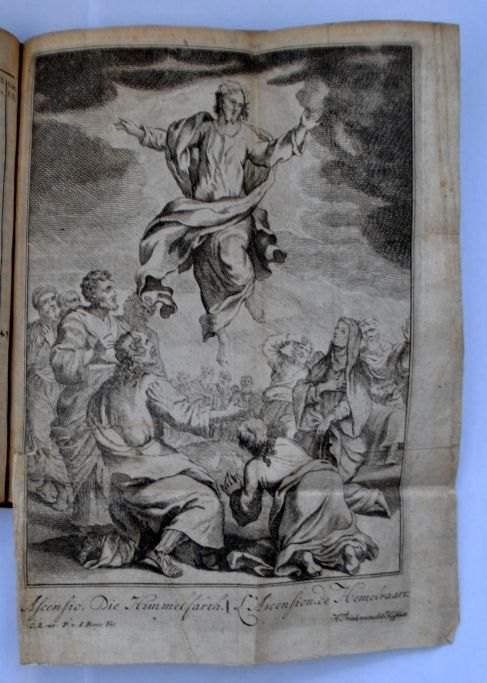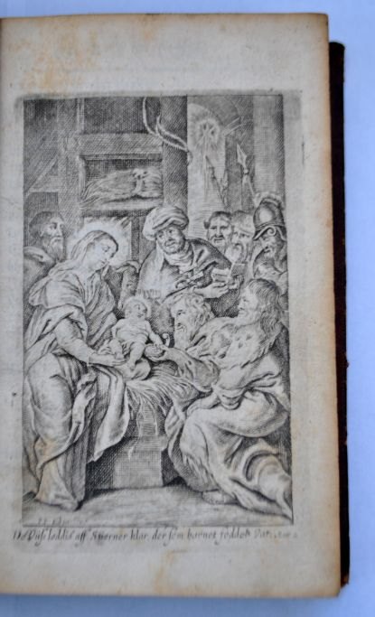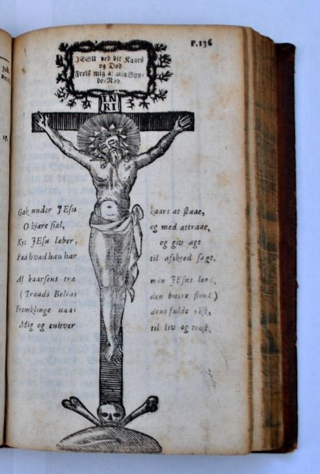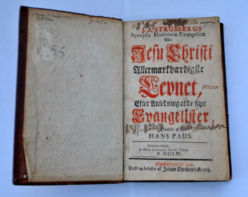 J. A. Strubbergs: Jesu Christi allermærkeligste Levnet, efter Anledning af de fire Evangelier. Oversat af Hans Paus. Trykt i København 1748. Hellæderindbundet. Med guldtryk på ryggen.