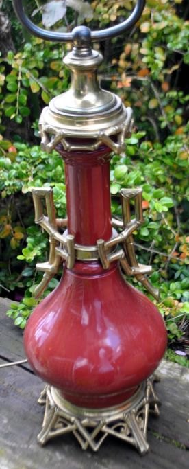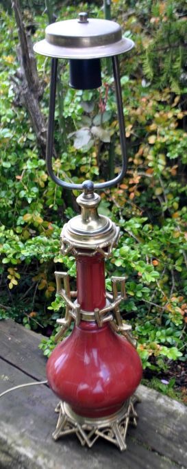 Fransk bordlampe, 19. årh. Tidligere petroleumslampe, omgjort til el. Bronze og korpus i okseblods farvet porcelæn. H.: 65 cm.