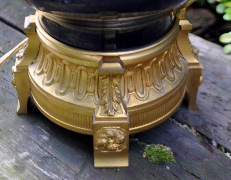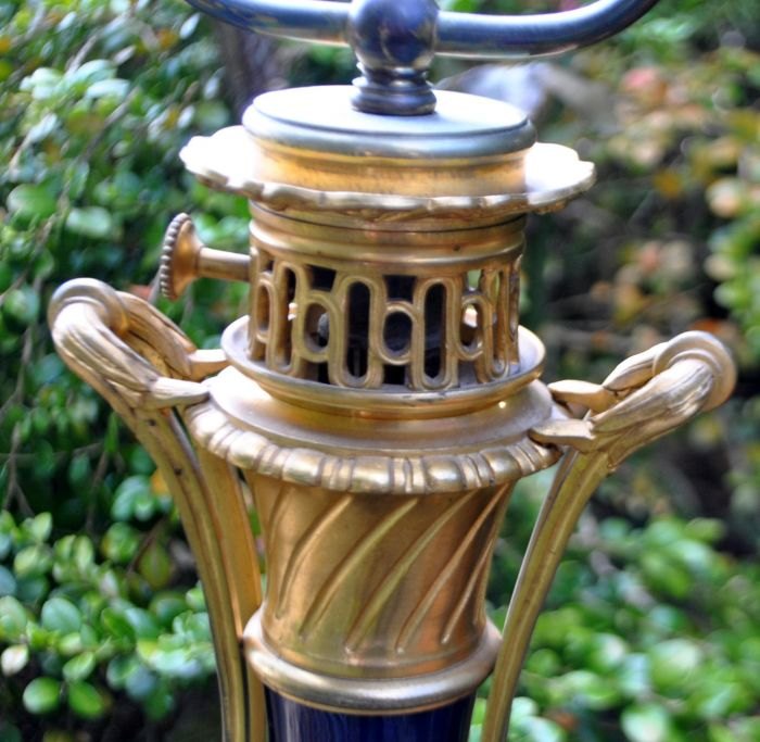 Fransk bordlampe, 19. årh. Tidligere petroleumslampe, omgjort til el. Forgyldt bronze og korpus i blåt porcelæn. Med smukke dekorationer af engle. H.: 65 cm.