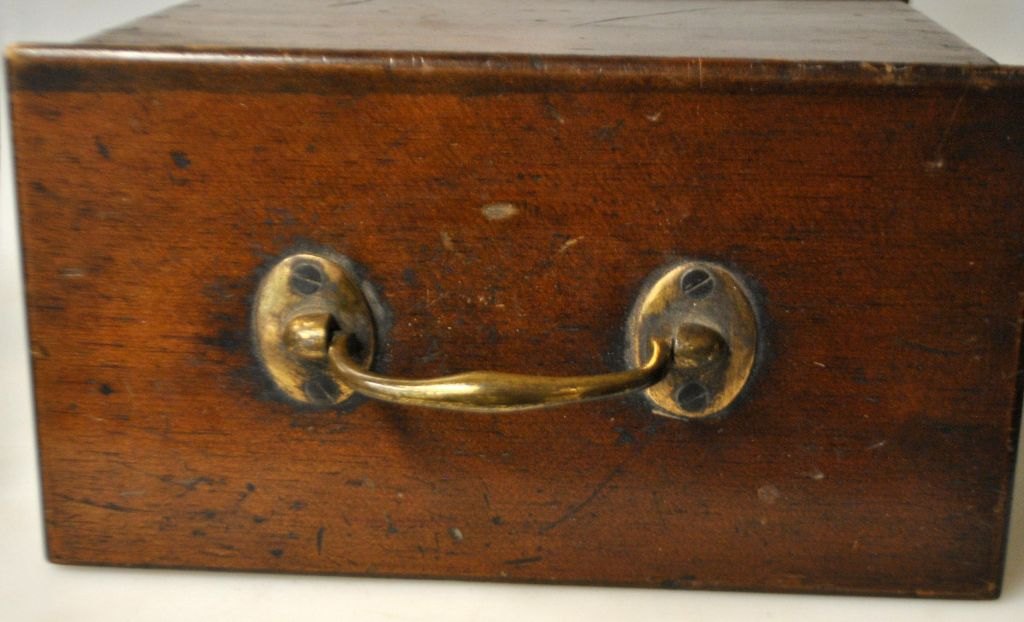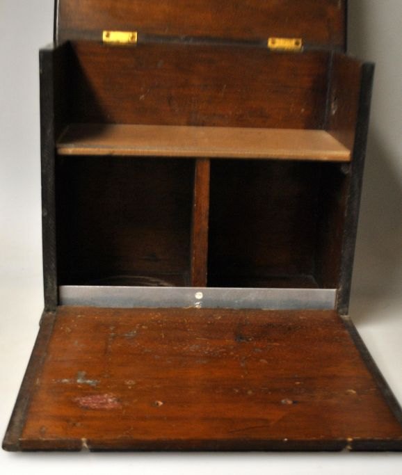 Engelsk æske i mahogni med håndtag. 19. årh. Med opklappelig låge. Indvendig med tre rum. Håndtag i messing. B.: 16 cm. L.: 28 cm. H.: 25 cm.