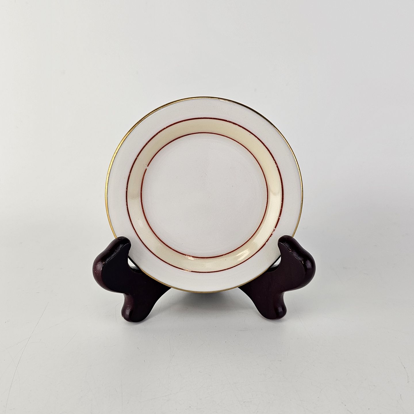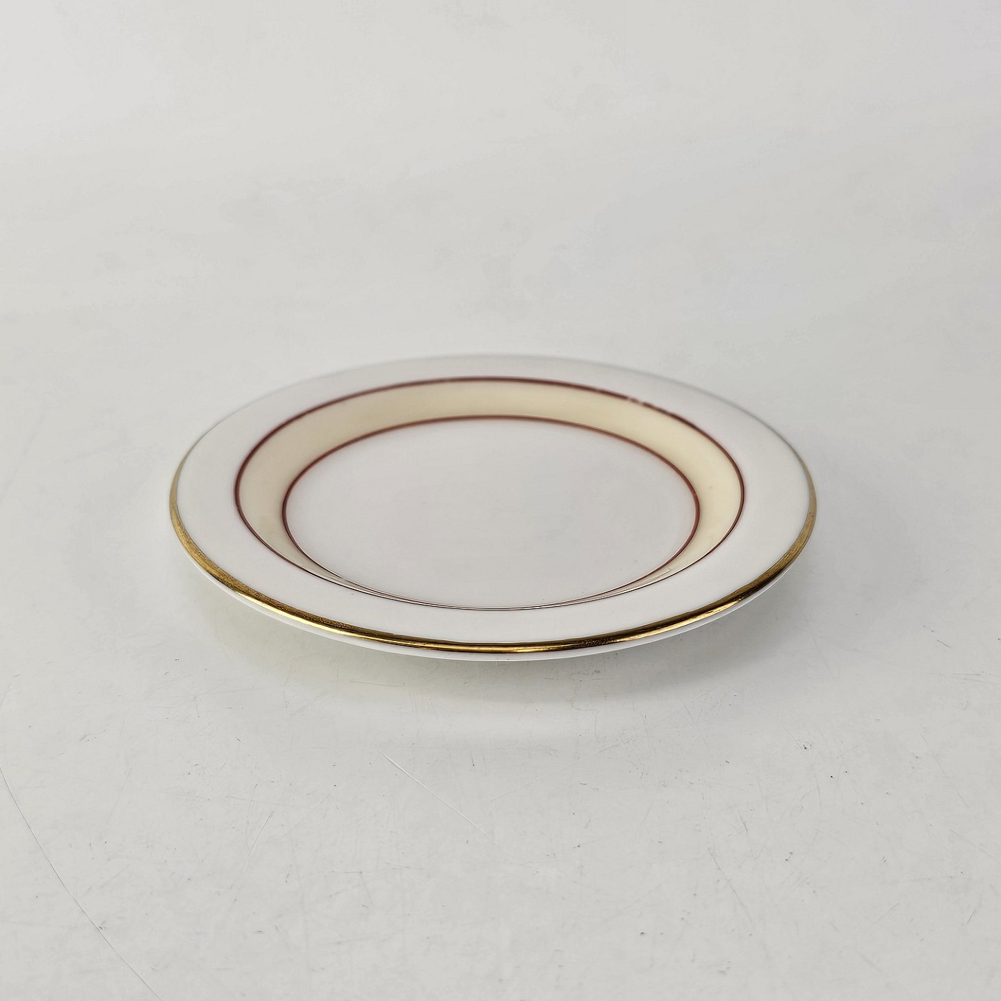 Service i glat hvidt porcelæn pyntet med dekoration i beige, brændt orange og gylden streg.