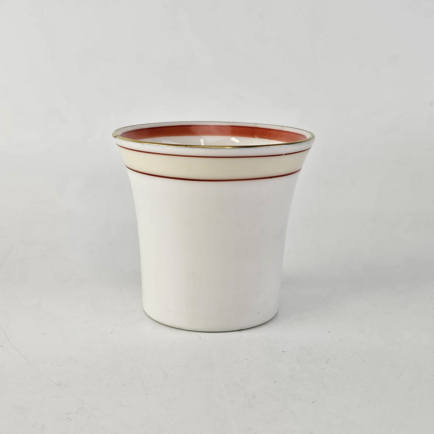 Service i glat hvidt porcelæn pyntet med dekoration i beige, brændt orange og gylden streg.