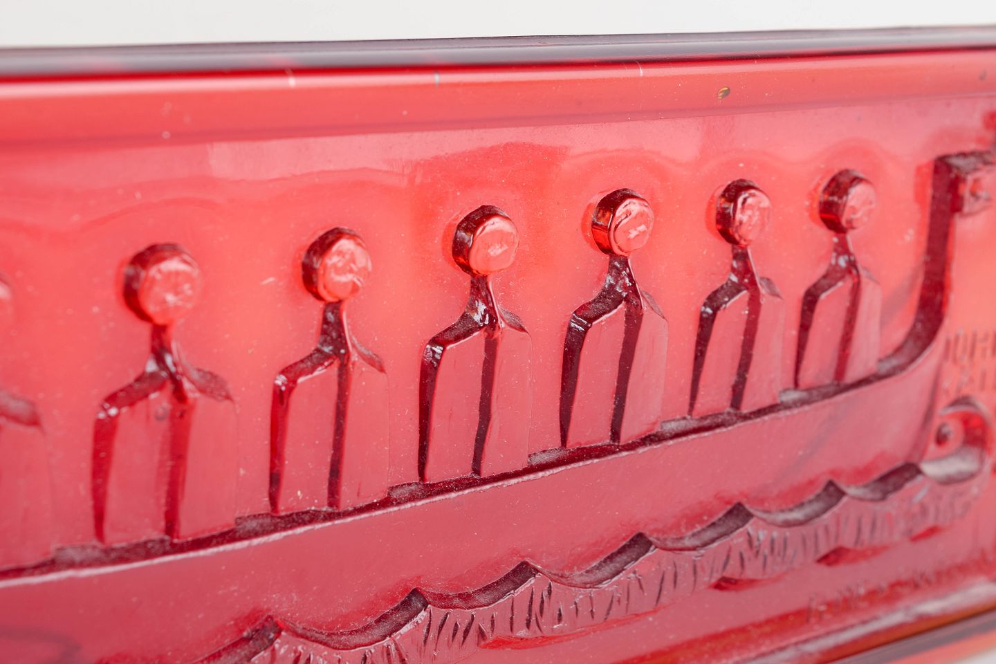 Rektangulært væghængt relief i dyb rød/orange glasmasse, signeret John Käll i formen og mærket ELME SWEDEN. Stiliseret vikingeskib med besætning i procession og bølgende havmotiv.