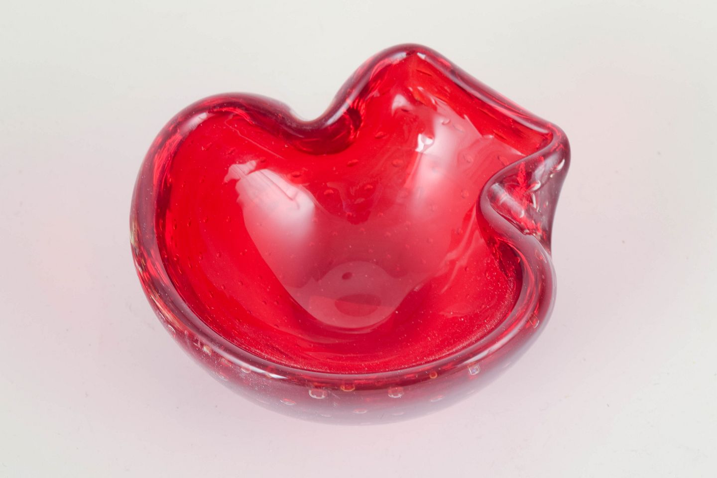 Organisk formet mundblæst skål i rød sommerso-teknik med fanget luftboblemønster (bullicante), typisk for italiensk Murano-glasproduktion.