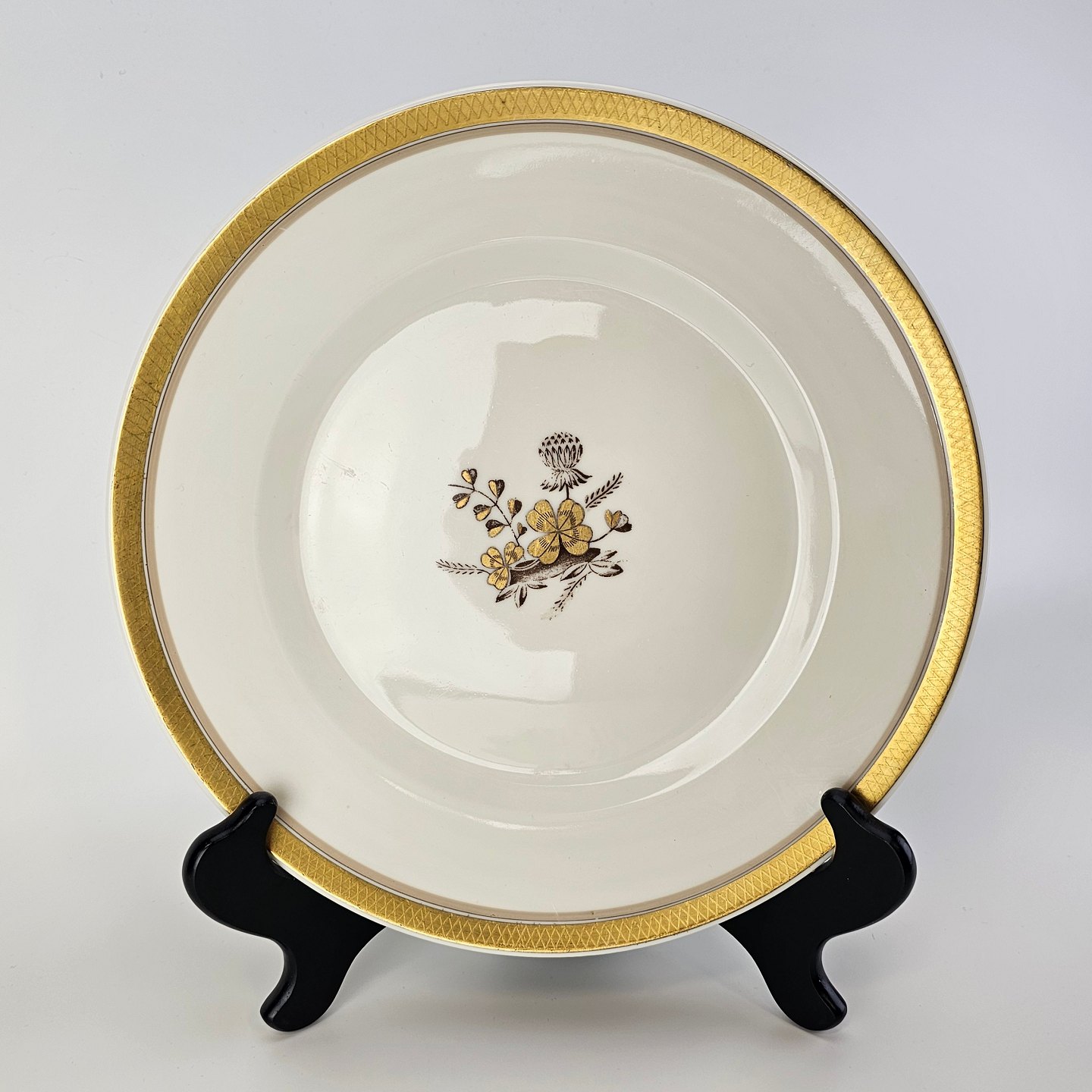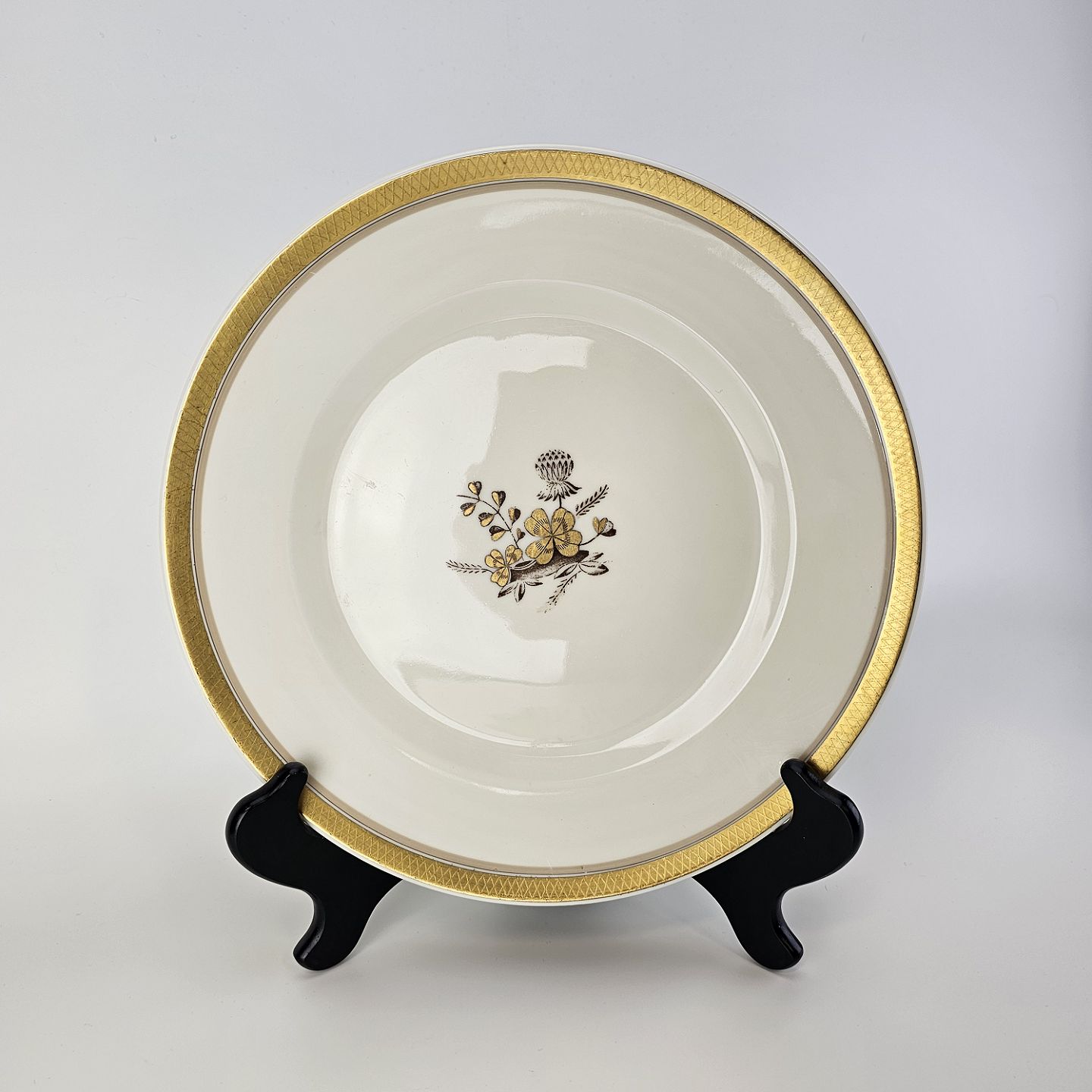 Cremefarvet porcelæn med motiv af gylden kløverblomst og bred graveret guldkant