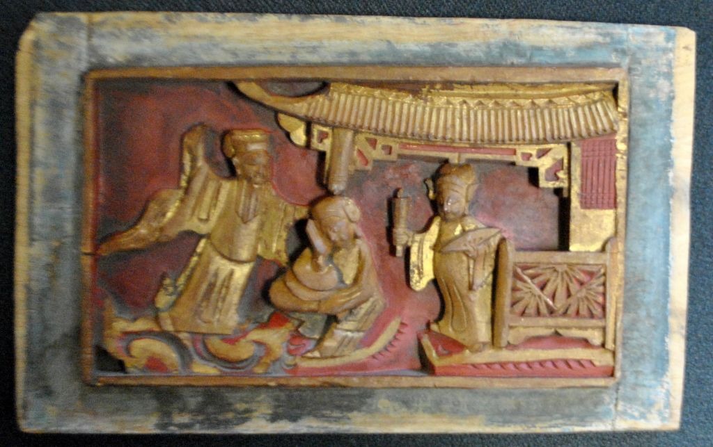 Antik kinesisk bemalet træskæring, 19. årh. Med sceneri med personer i tempel. 15 x 24 cm.