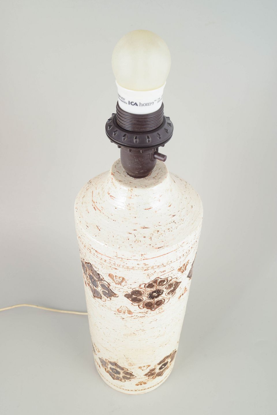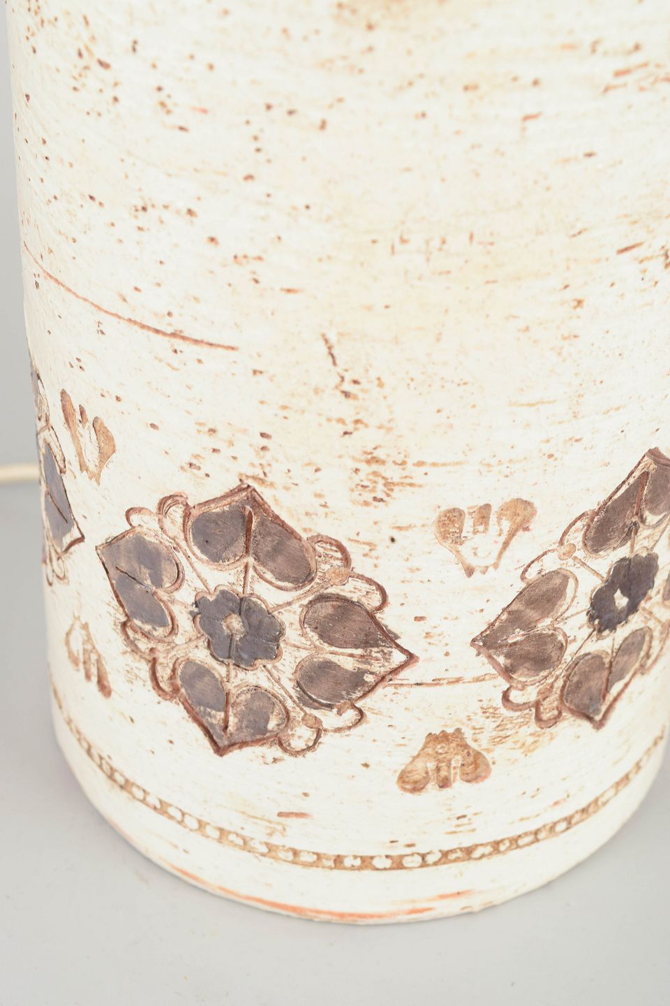 Meget stor cylindrisk bordlampe i stentøj med karakteristisk Bitossi-relief og hånddekorerede brunlige ornamentbånd på lys craquelé-glasuret overflade.