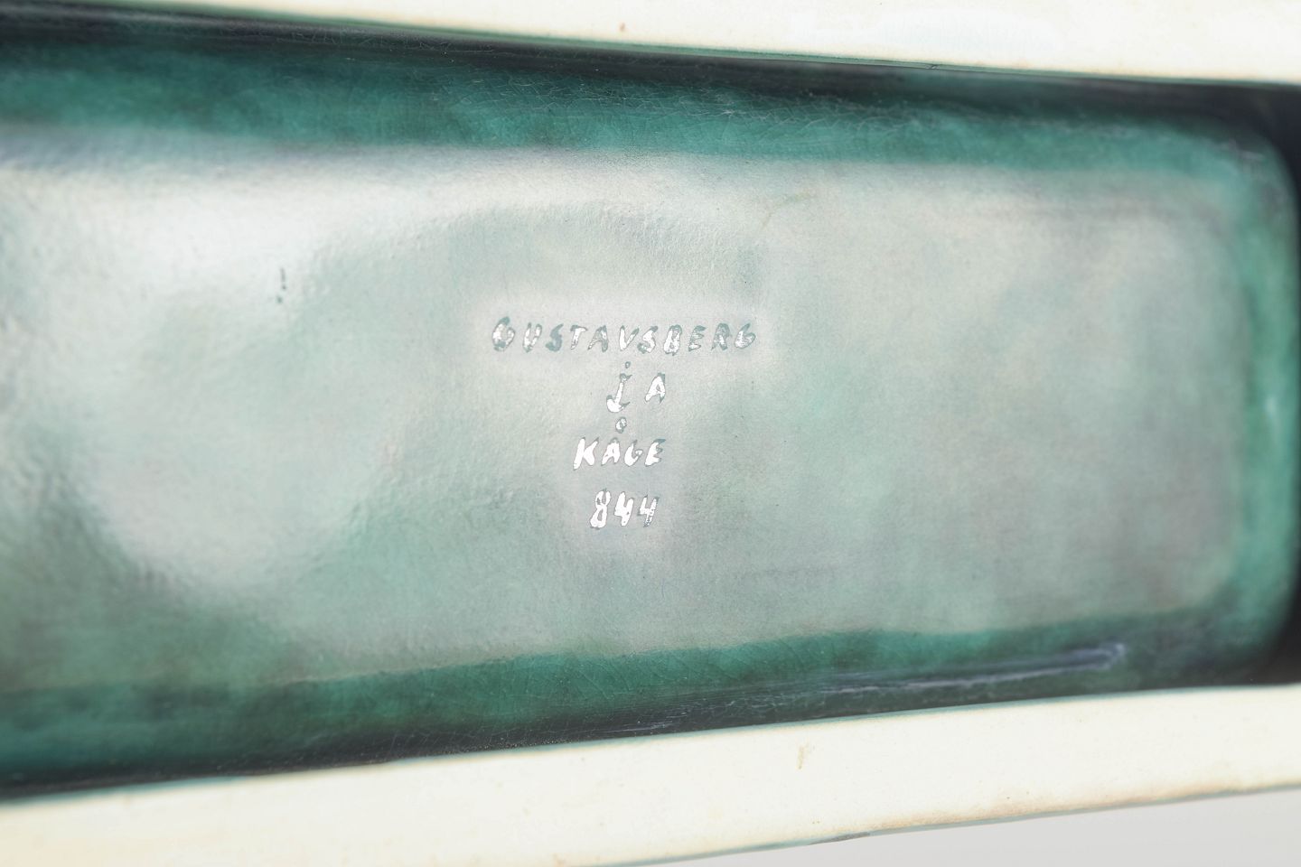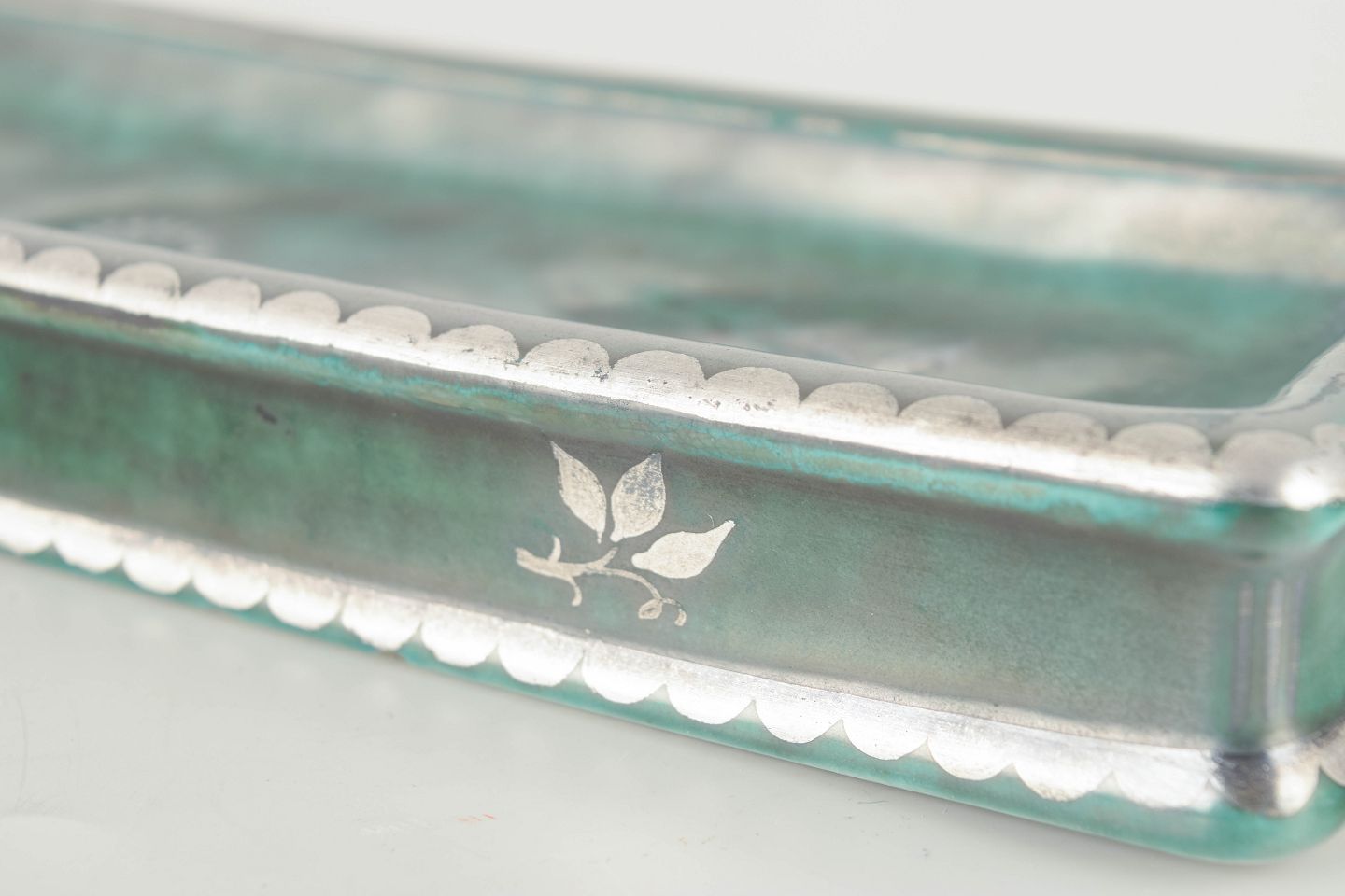 Rektangulær Art Deco penbakke i glaseret stentøj med Gustavsbergs karakteristiske turkisgrønne Argenta-glasur og indlagte sølvdekorationer af stiliserede blomster og bladmotiver.