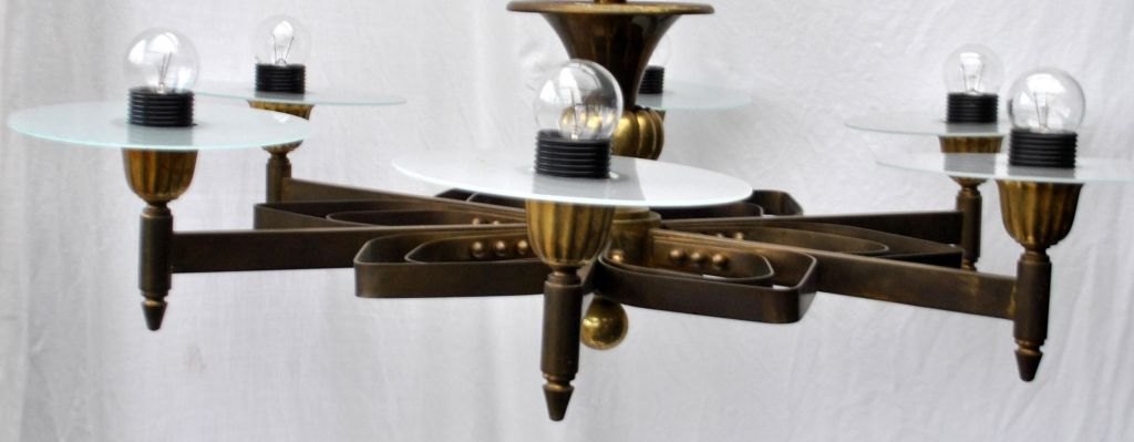 Dansk funkis loftslampe i bronze, ca. 1930. Med 6 lysarme. H.: 60 cm. Dia.: 80 cm.
