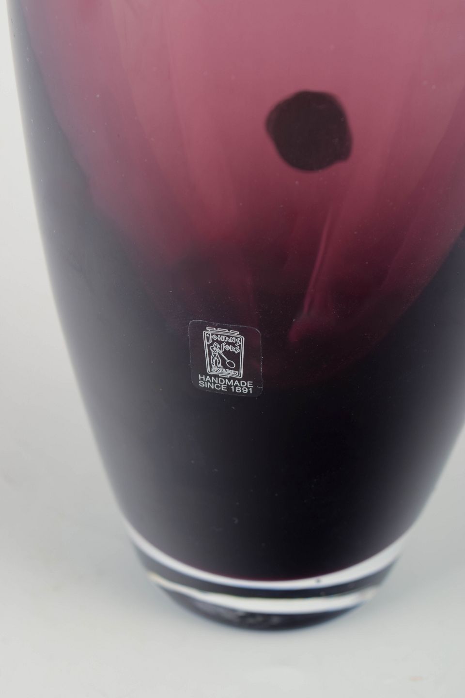 Stor håndlavet kunstglasvase i dyb ametystfarve med sort base og klare detaljer. Elegant cylindrisk form med slebet kant og indgraveret signatur fra Helén Tapper for Johansfors Glasbruk. Et karakteristisk eksempel på svensk glasdesign fra 1970’erne.