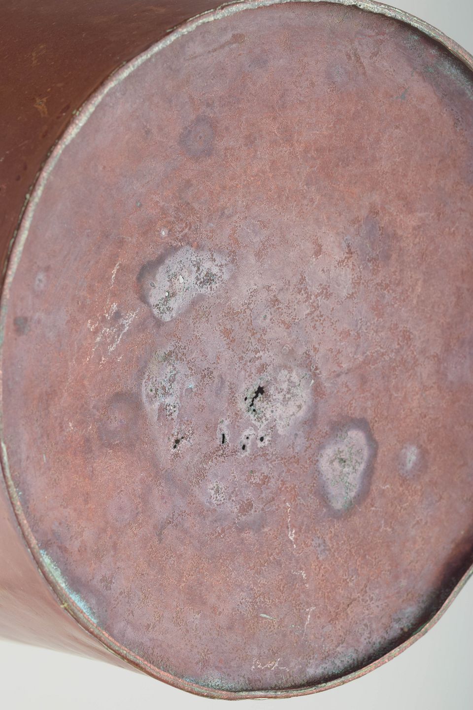 Kobber barselsspand med låg og buet hank. Traditionelt anvendt i danske husholdninger i 18–19. århundrede, ofte som barsels- eller husholdningsspand. Viser smuk, varm patina og brugsspor fra alder.