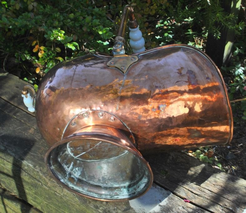 Antik kobber kulspand, 19. årh. På rund fod. Med håndtag i hvidt opaline glas. L: 49cm. H: 33 cm. Højde med håndtag: 47 cm.
