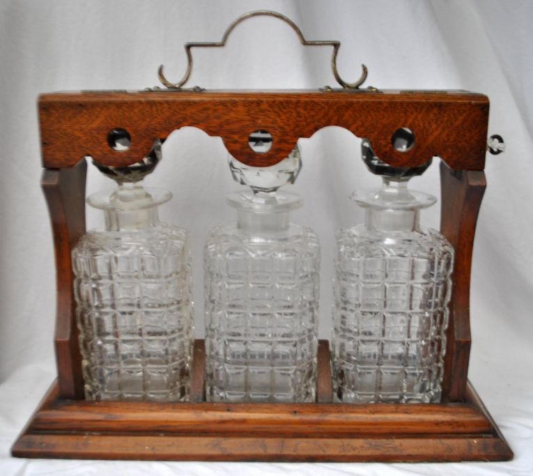 Engelsk tantalus med tre krystal karafler, 19. årh.