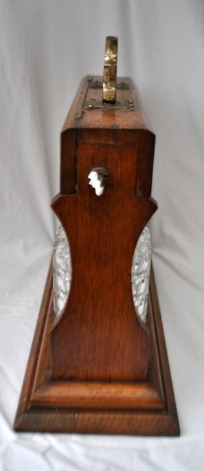 Engelsk tantalus med tre krystal karafler, 19. årh. Egetræ. Med messingbeslag og lås med nøgle. H: 33 cm. L: 37 cm.