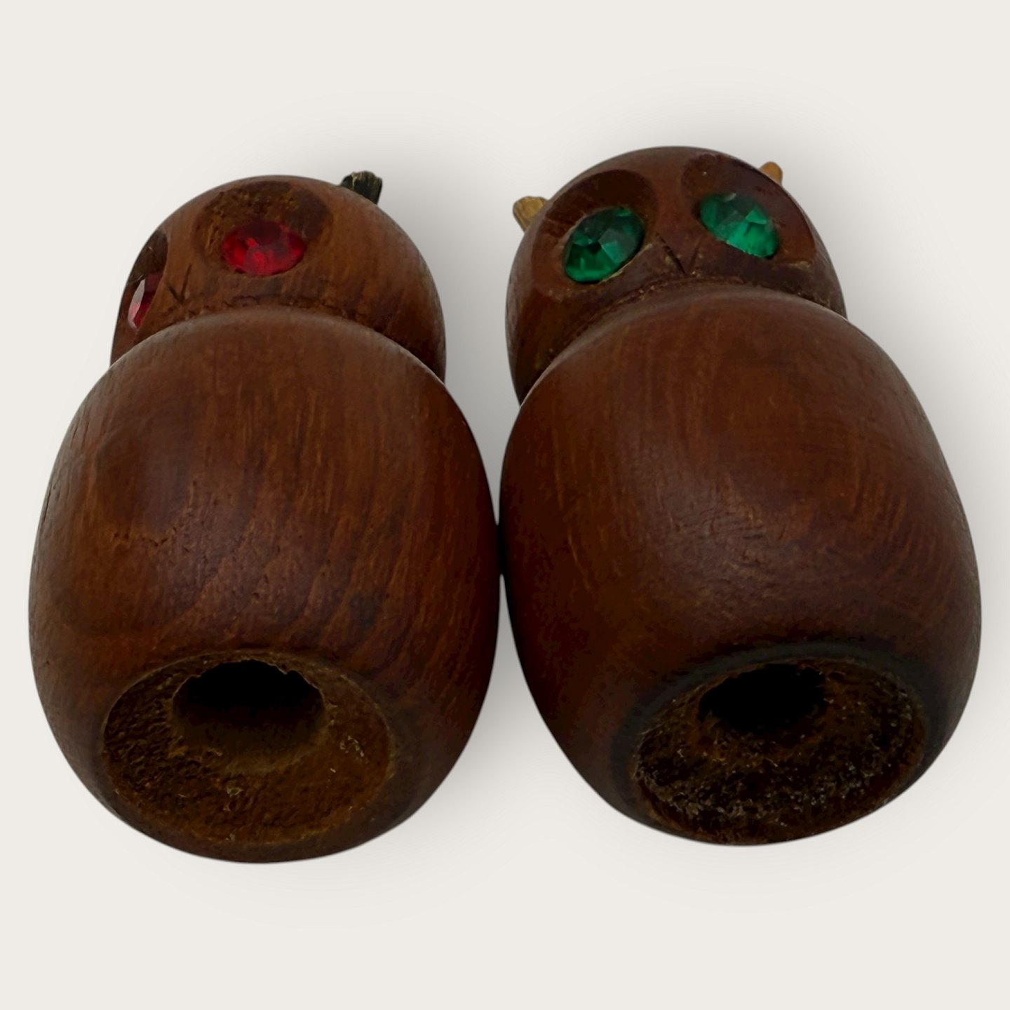 Salt og pebersæt i teaktræ fra 1960'erne, fugle / ugler med grønne og røde øjne, fremstår pænt patineret og uden bundpropper.