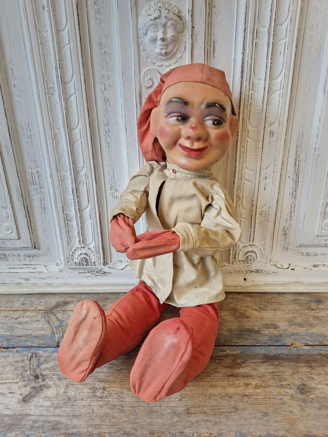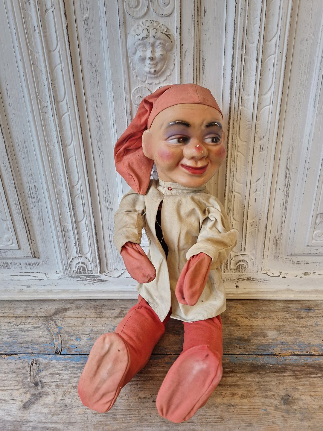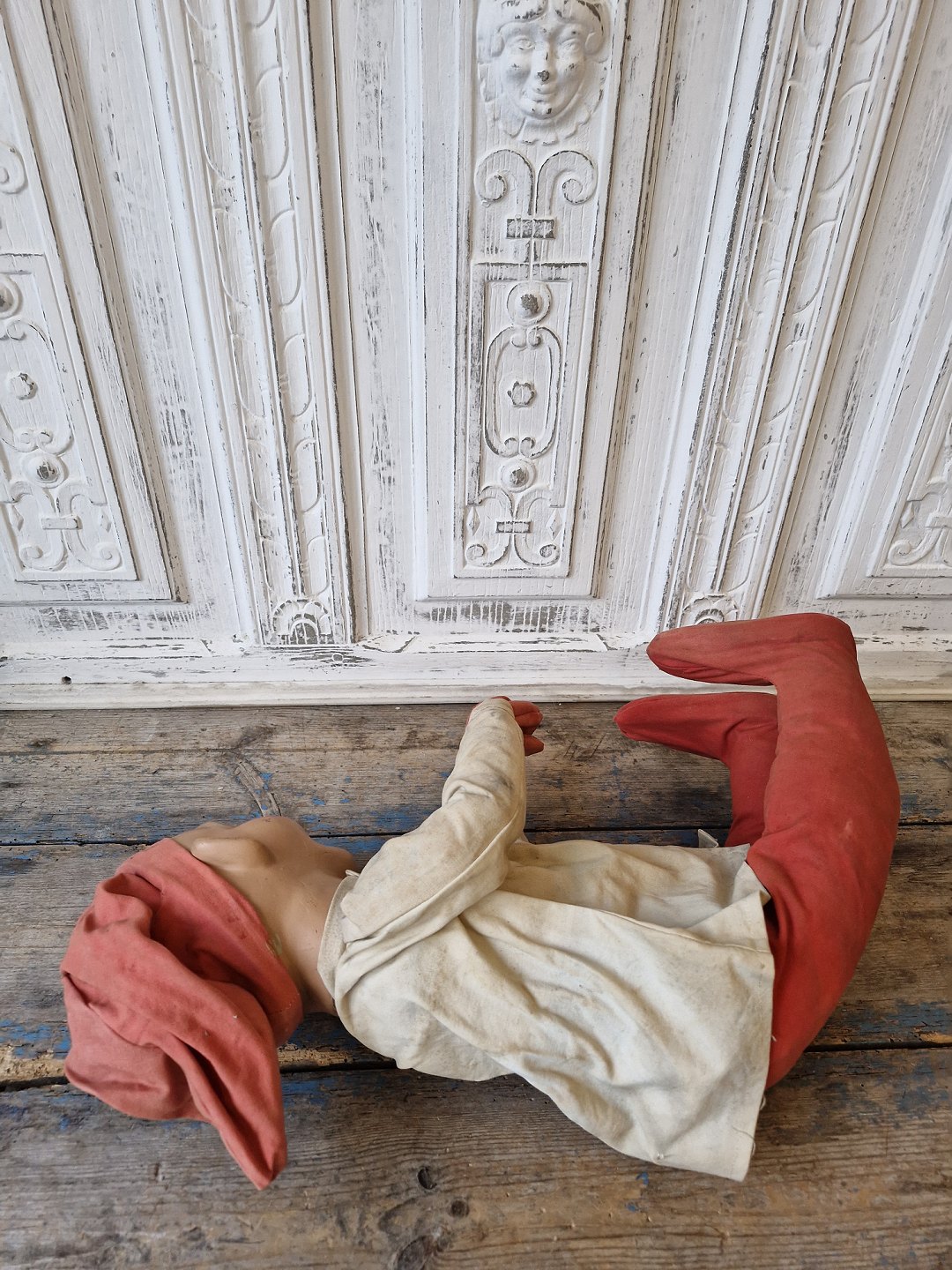Stor gamle fin butiks nisse, hovedet er fremstillet i håndmalet keramik, arme og ben kan bøjes.