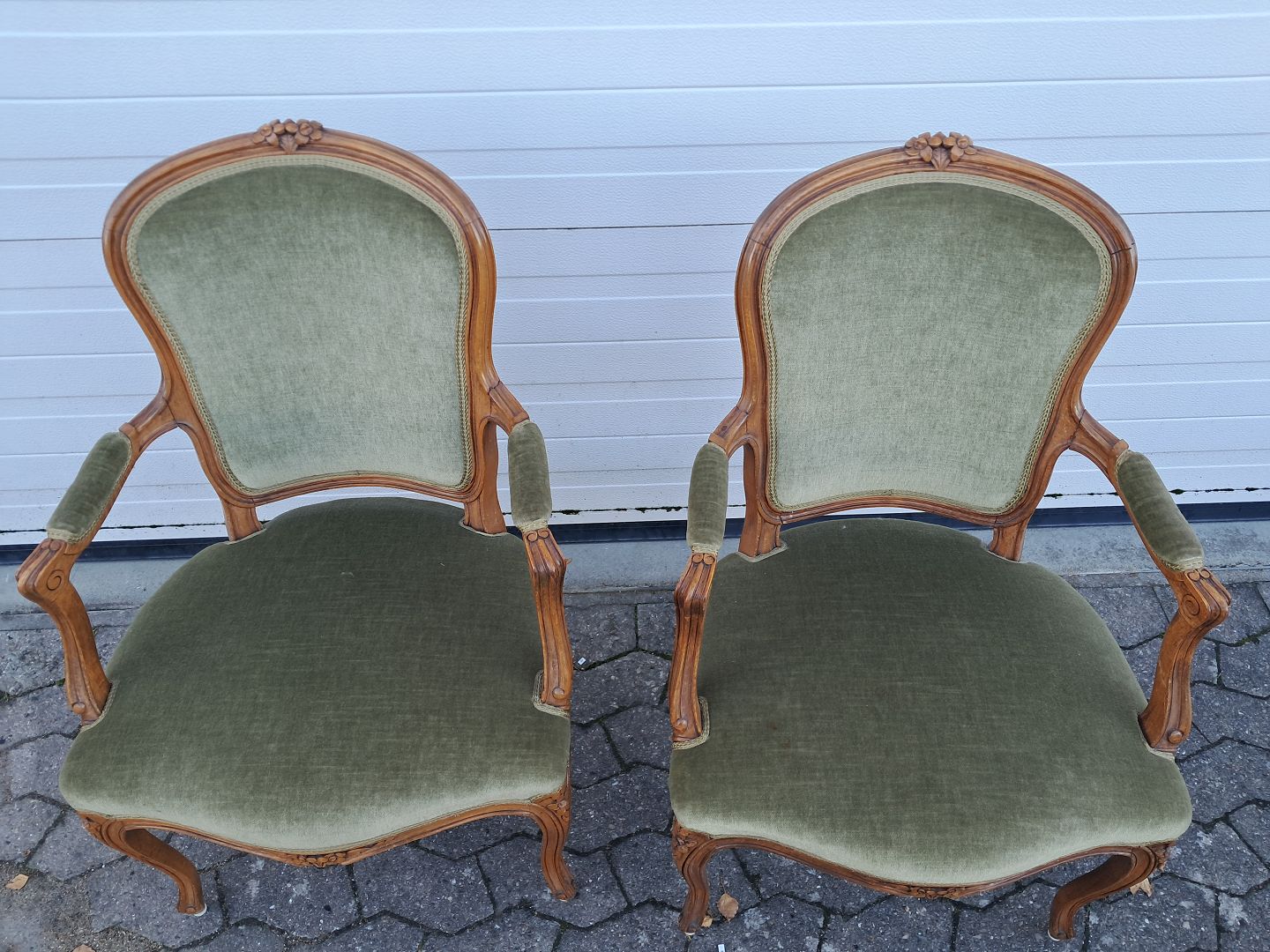 2 Rokokostole i massivt bøgetræ med velourbetræk, fra 1980erne.