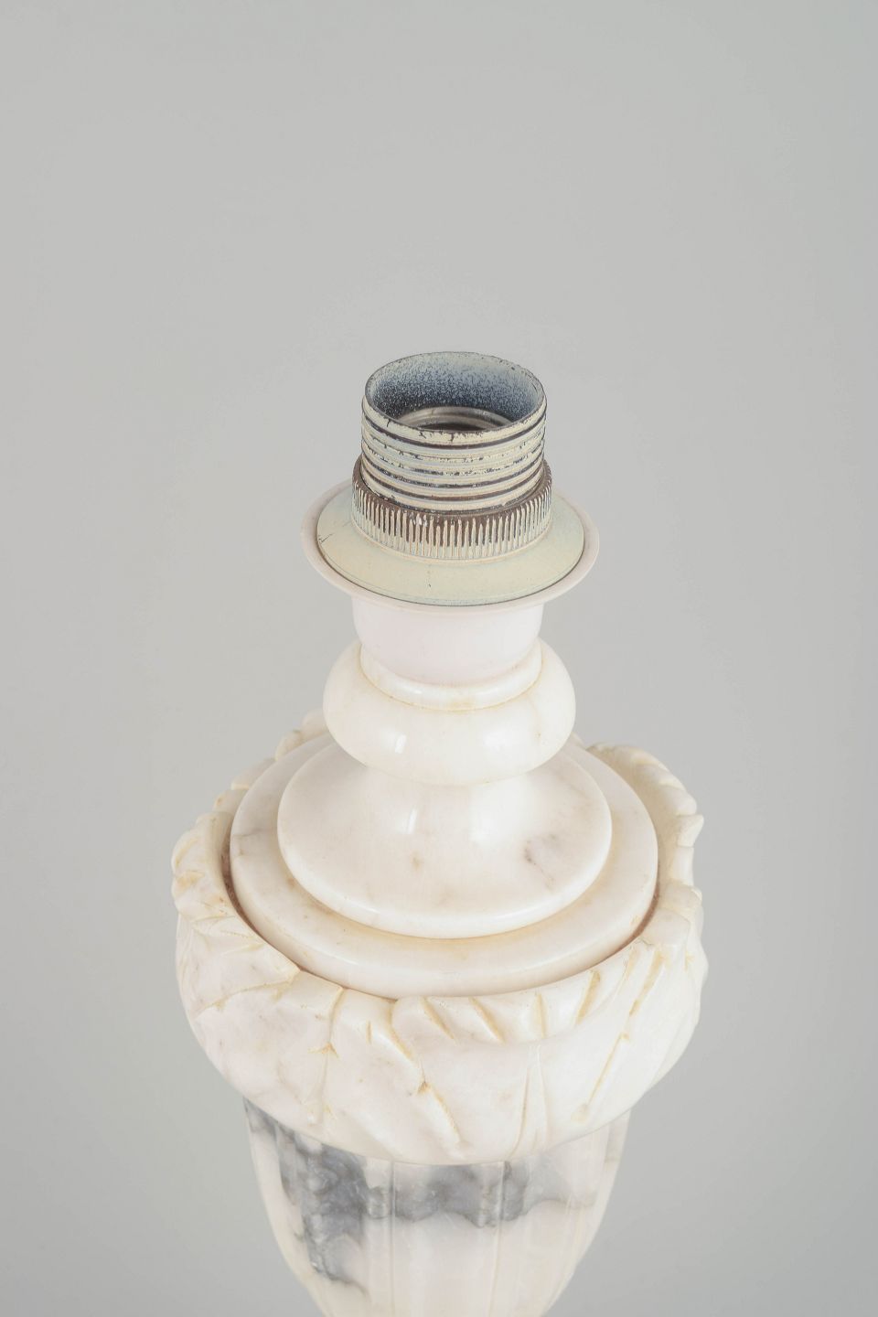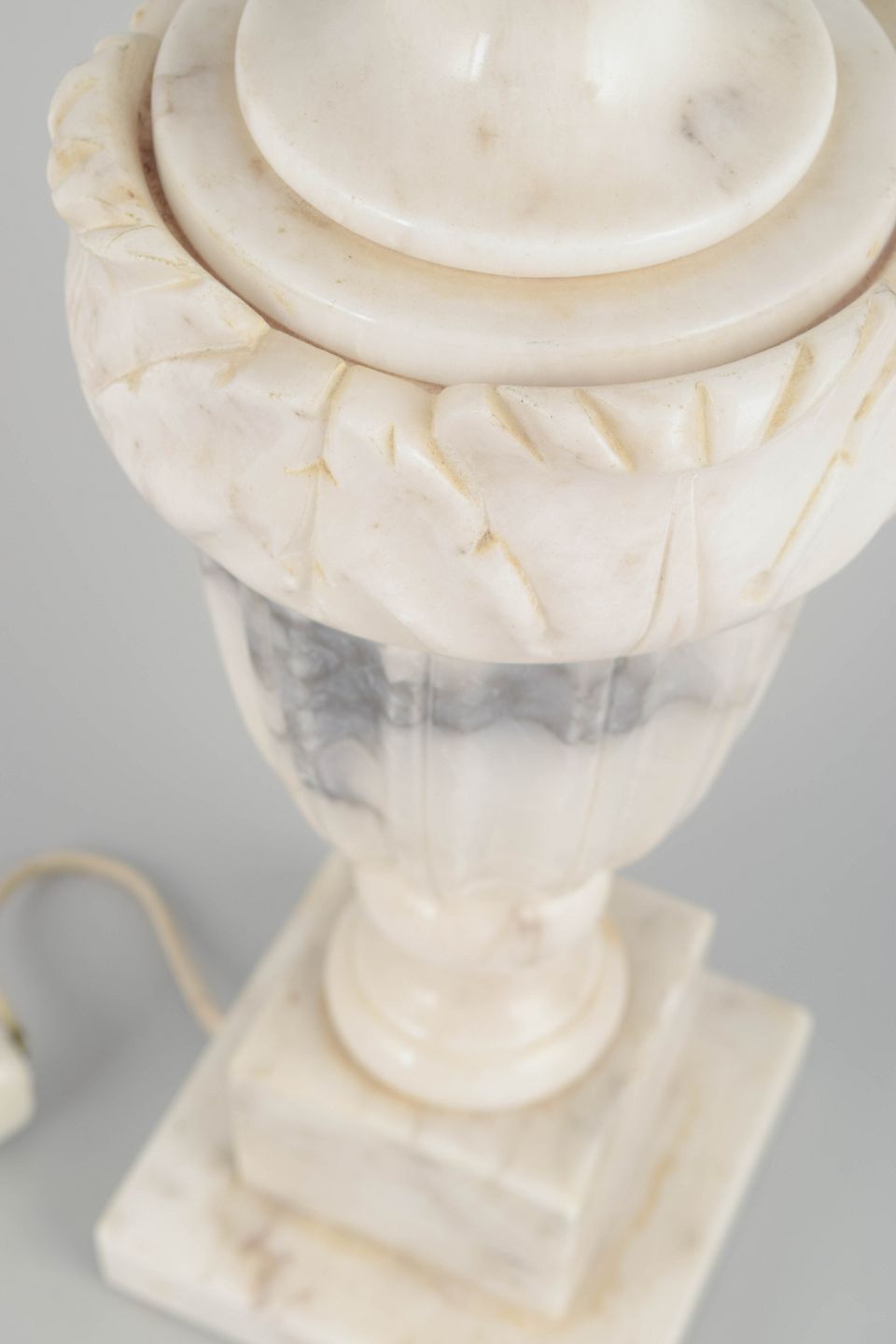 Større klassisk urneformet bordlampe udført i håndskåret alabast med markant fod og smukke grå årer i stenen. Et elegant eksempel på italiensk håndværk, der kombinerer klassiske proportioner med alabastens naturlige translucens.