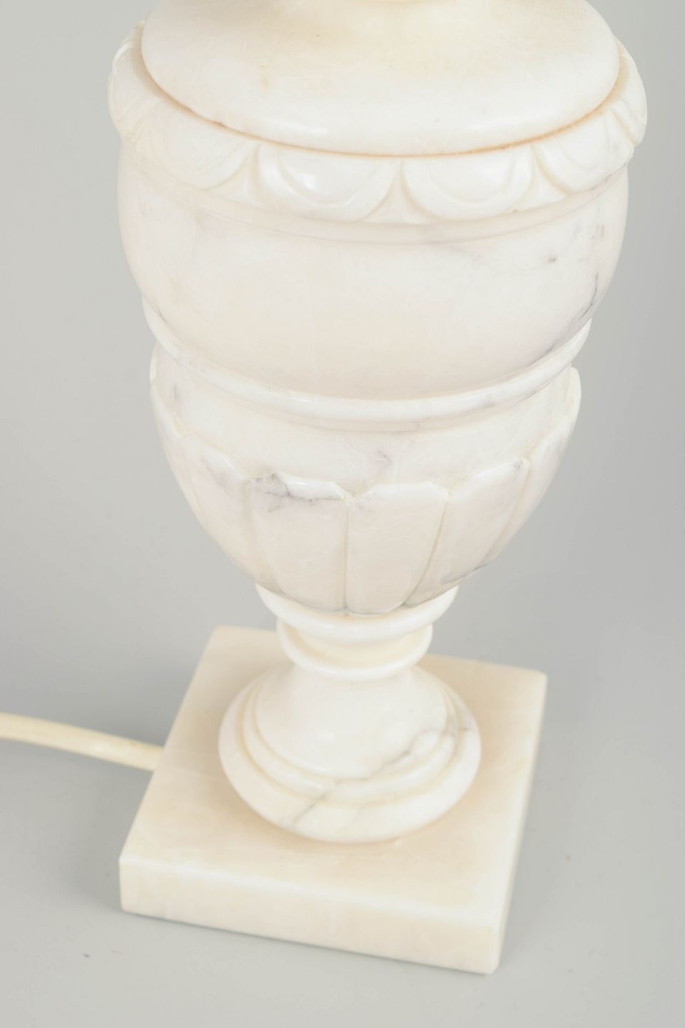 Elegant klassisk formet bordlampe udført i håndskåret alabast med kvadratisk fod og fint udskårne detaljer. Lampens varme hvide sten og bløde overflade fremhæver materialets naturlige årer og translucente skær.
