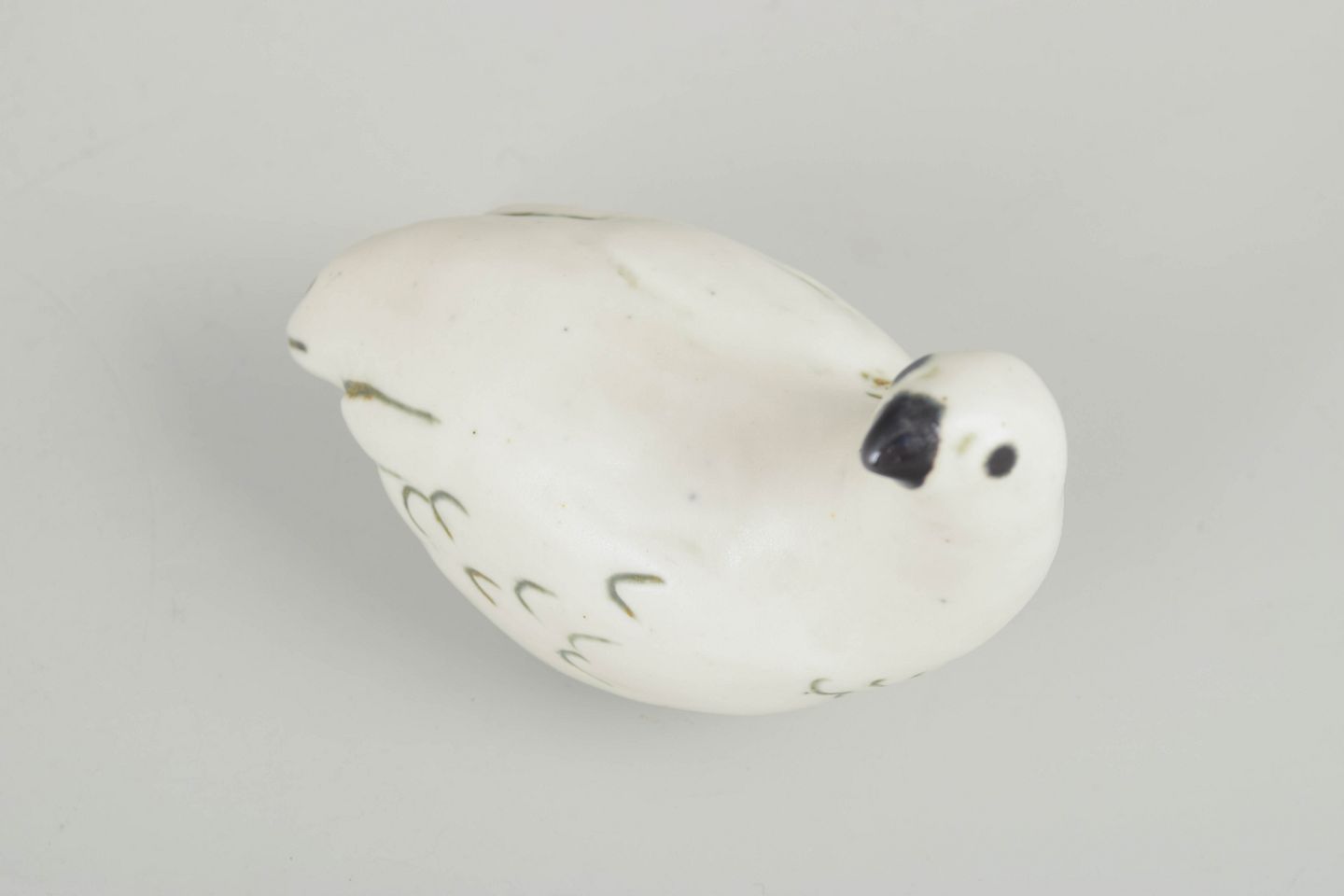 Skulpturel fuglefigur i glaseret stentøj, formet med bløde linjer og enkel dekor i grønne og sorte penselstrøg. Typisk for Allerts organiske formsprog og naturinspirerede udtryk.