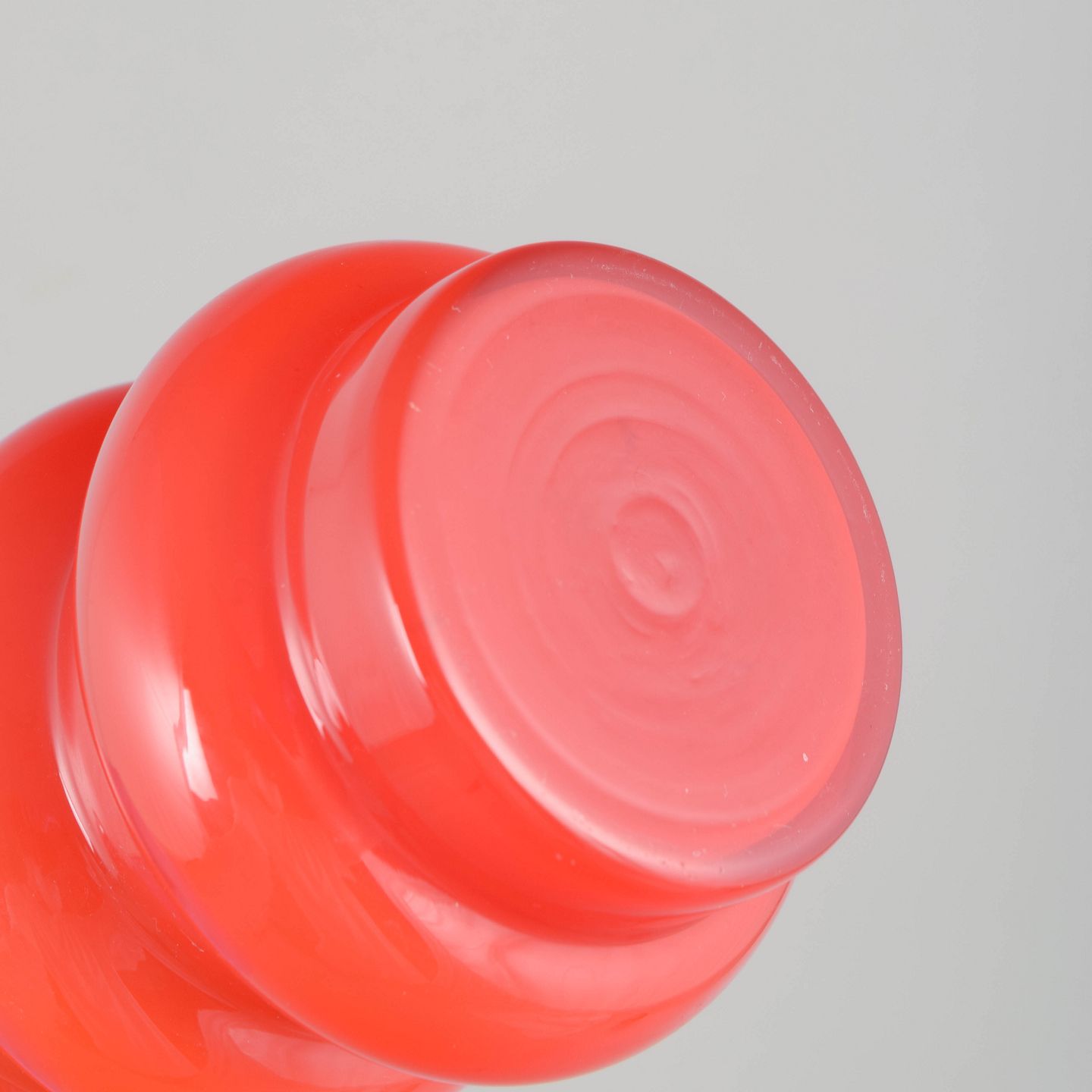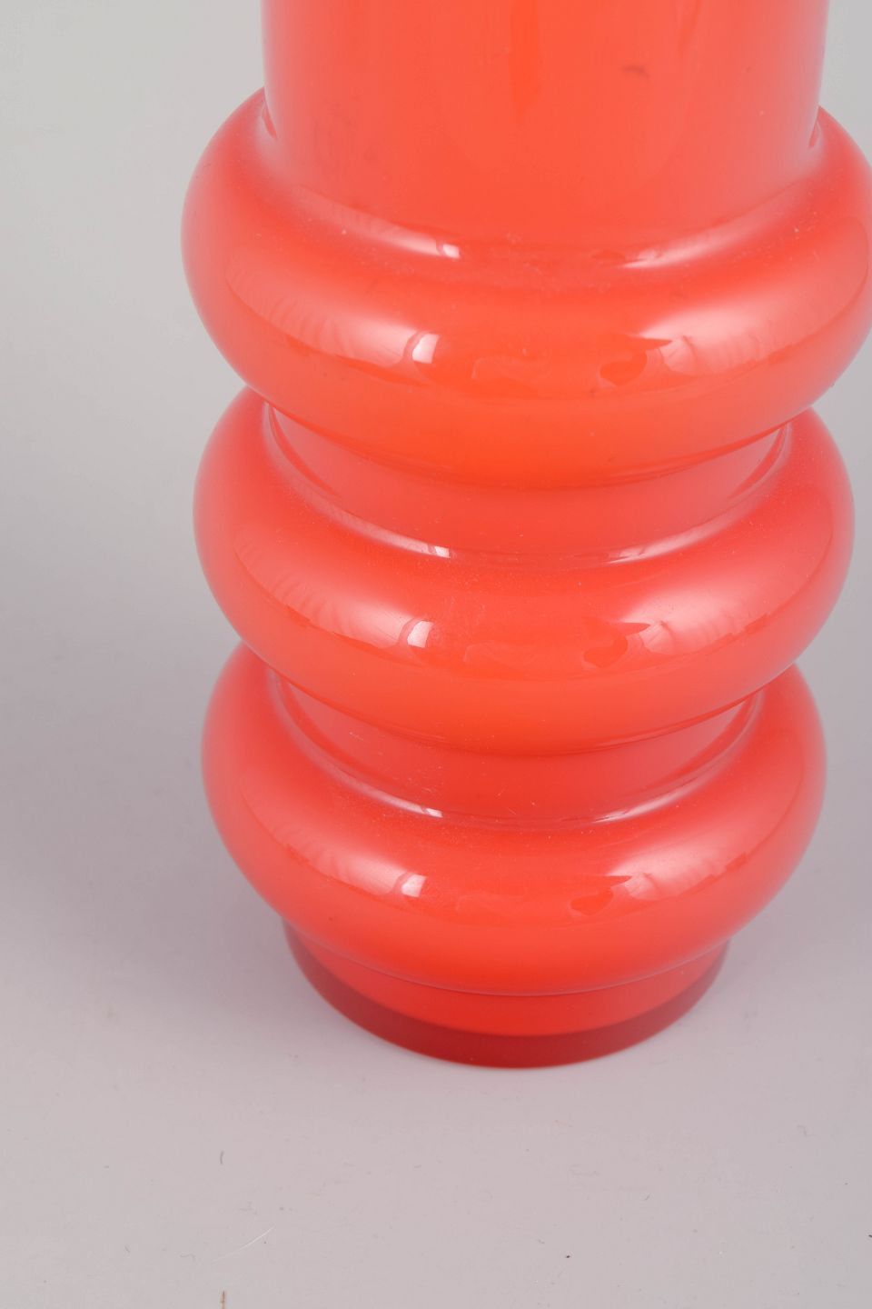 Mundblæst vase i intens orange glas med markant, skulpturel form bestående af cylindrisk krop med tre afrundede bånd. Et karakteristisk design fra 70’ernes svenske glaskunst, hvor form og farve blev brugt som dekorative virkemidler.