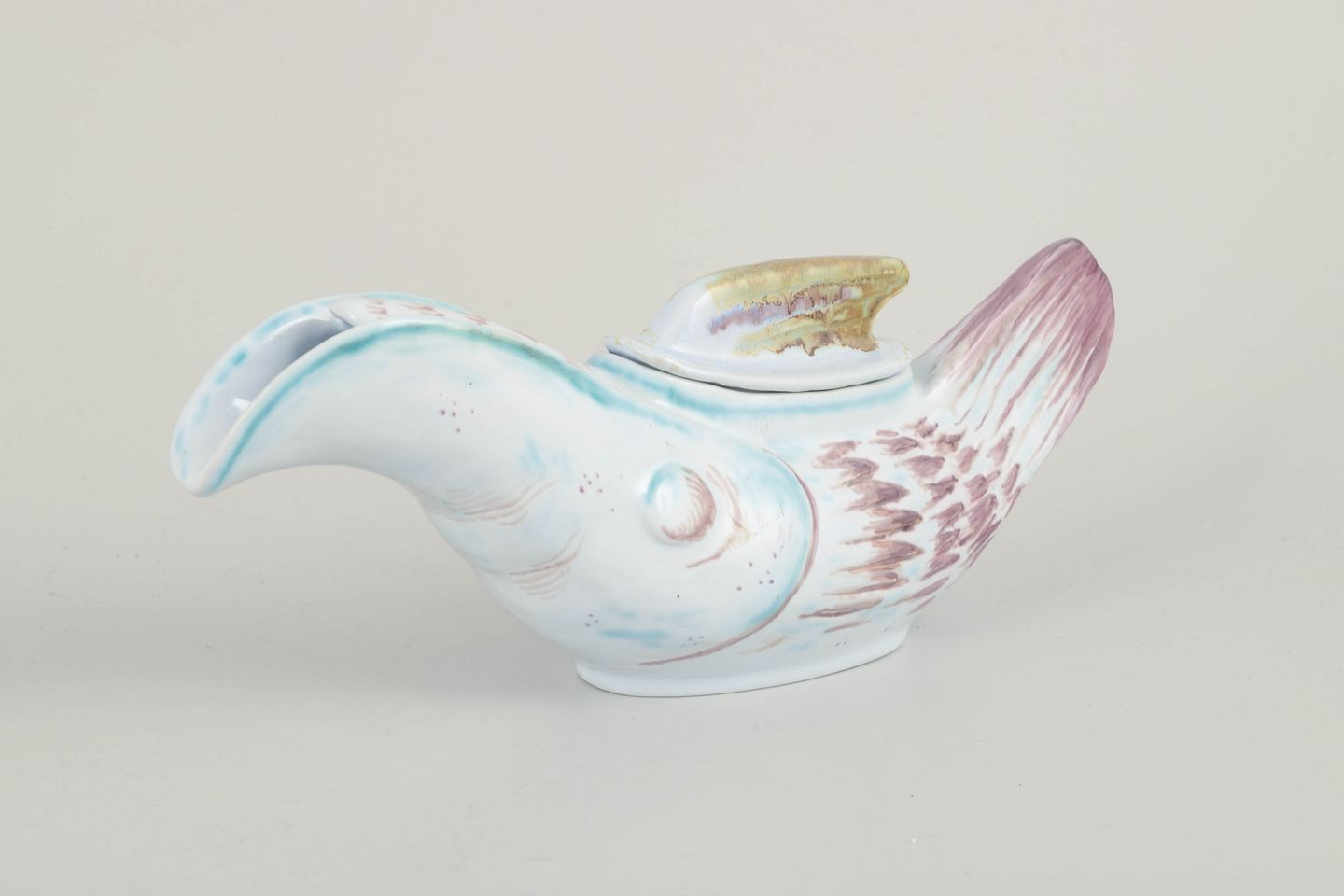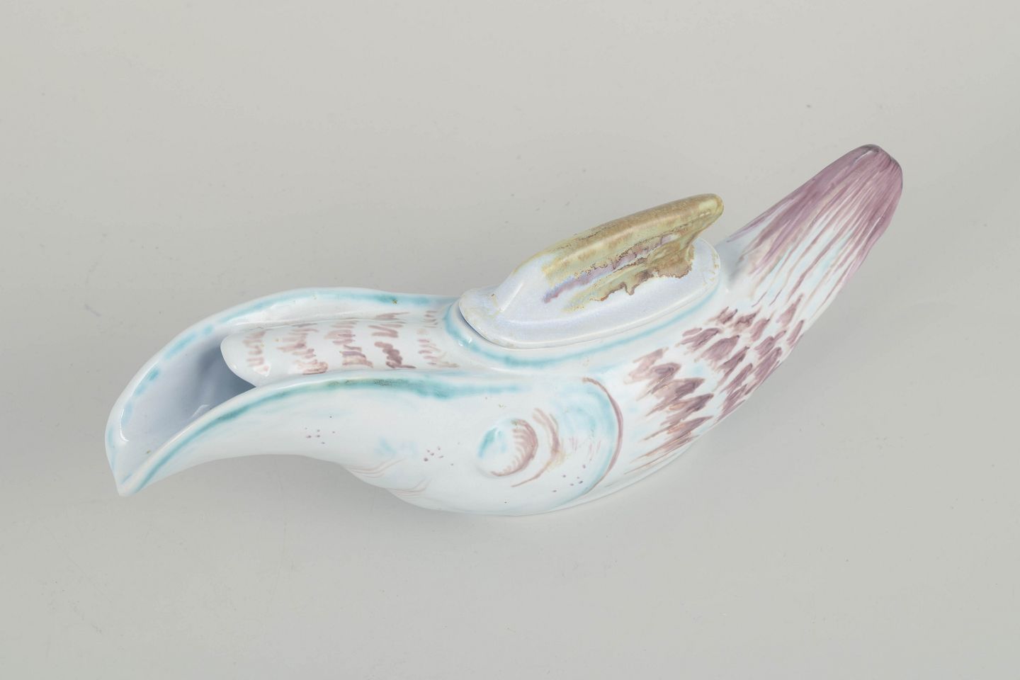 Figurativ sovseskål i form af en fugl, udført i fajance med håndmalet dekoration i lyseblå, rosa og gyldne toner. Et karakteristisk eksempel på Aluminia’s legende formsprog i midten af det 20. århundrede.