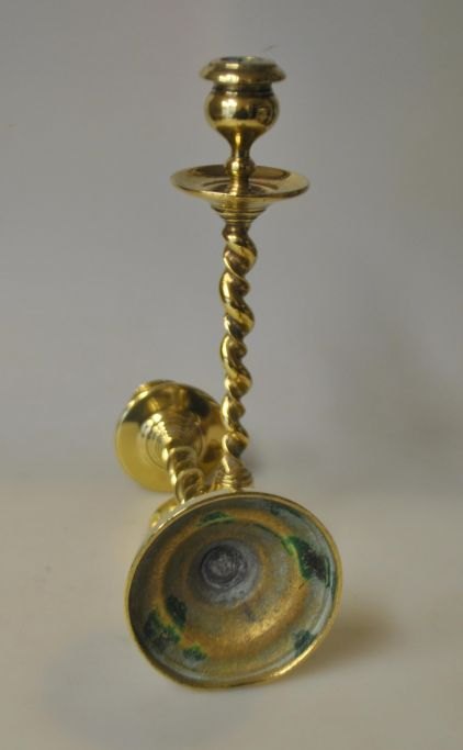 Par danske antikke messingstager, 19. årh. Med snoet stamme. H.: 19 cm.