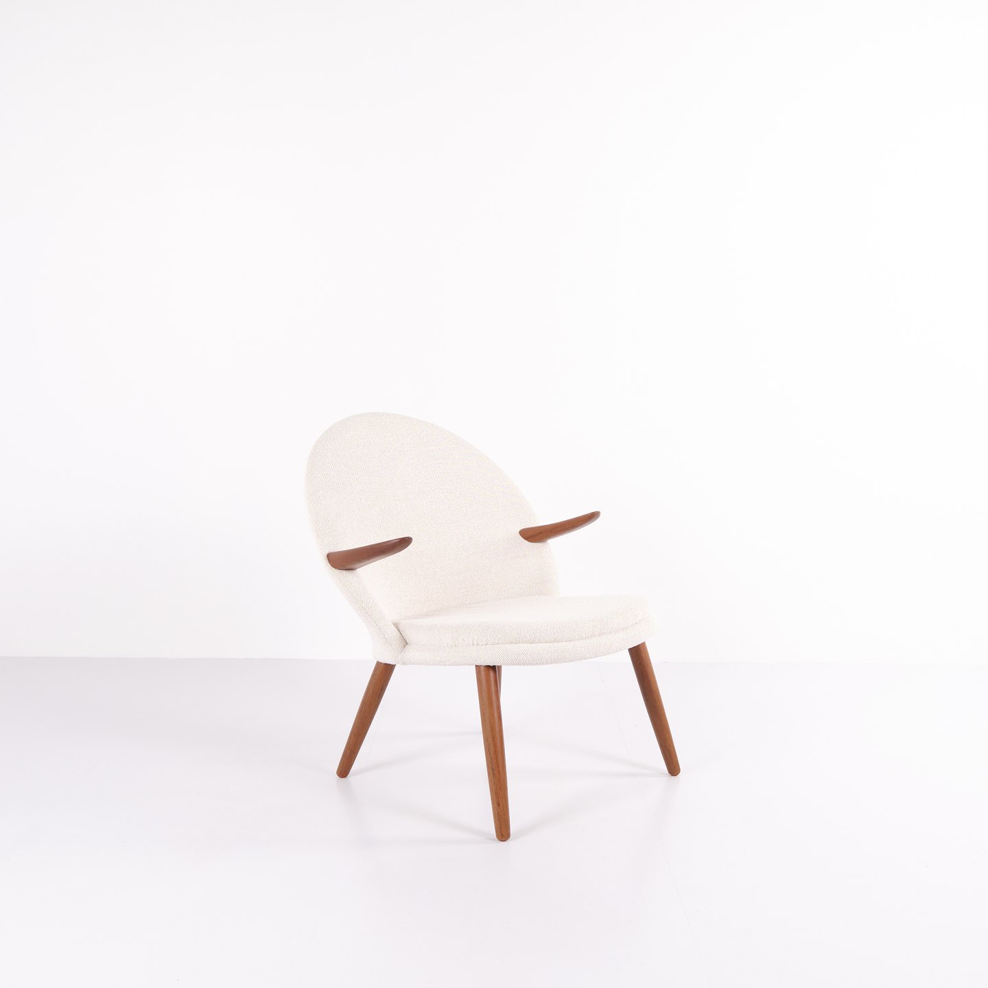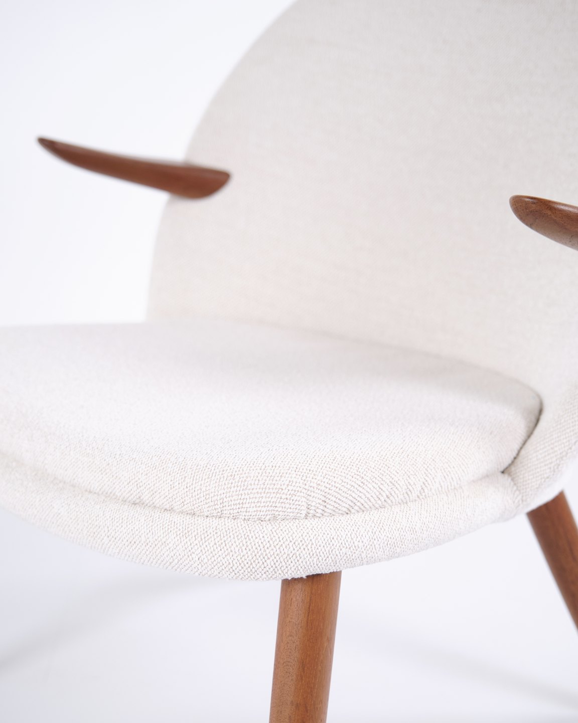 Kurt Olsen lænestol fra Glostrup Møbelfabrik. Teaktræ med lyst stof, 1960’erne.
