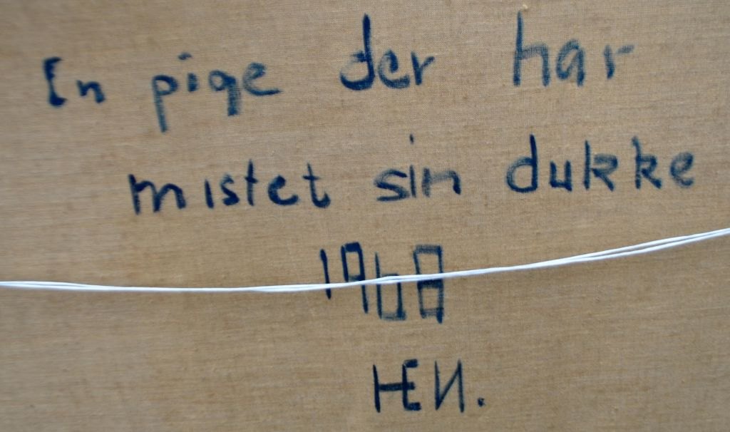 Dansk kunstner (20. årh.): En pige, der har mistet sin dukke. Olie på lærred. Verso tekst og monogram 1968. 66 x 100 cm.