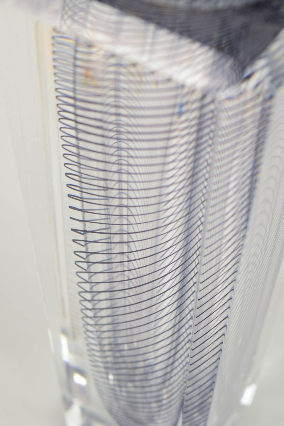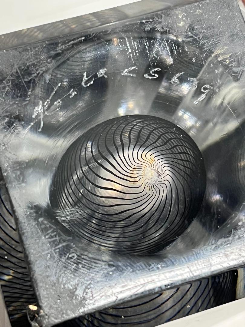 Optisk vase udført i massivt klart glas med indlagt spiralformet sort mønster, slebne og polerede flader. Et sofistikeret eksempel på Lindstrands sene design for Kosta Boda, hvor teknisk præcision og visuel bevægelse mødes i et skulpturelt formsprog.
