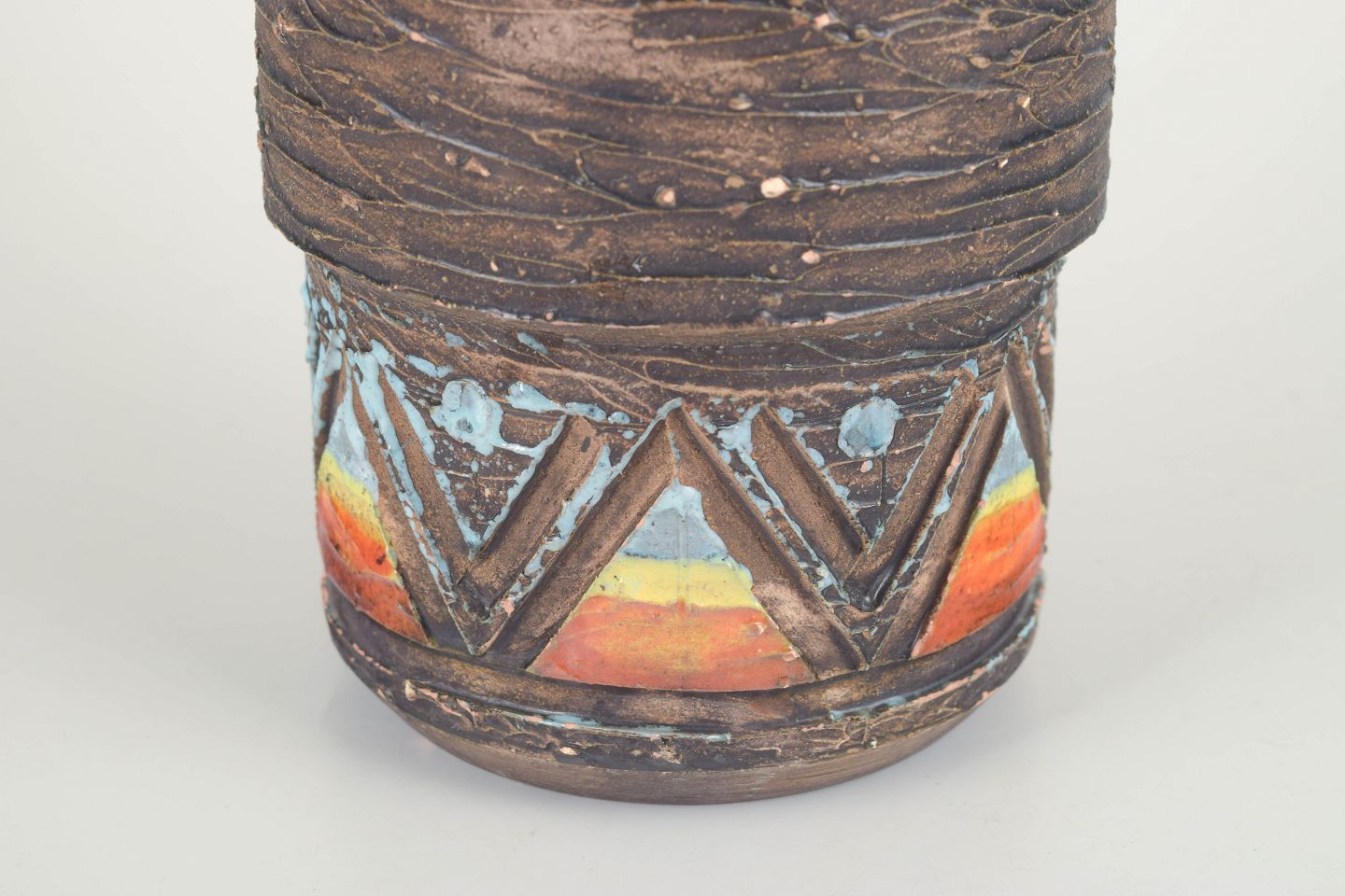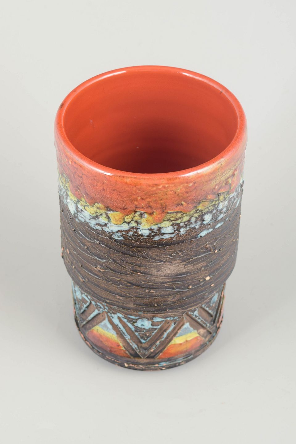 Cylindrisk håndlavet vase i chamotte-ler med rustik struktur og geometrisk reliefdekoration. Overfladen er dekoreret med flerfarvet lava-effekt glasur i nuancer af rød, orange, blå og brun, samt glat, blank inderside i koralrød. Et karakteristisk eksempel på Tilgmans’ kombination af rå materialitet og levende glasurarbejde.