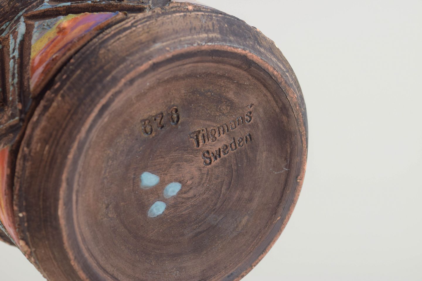 Tilgmans Keramik i Göteborg blev grundlagt i 1940’erne og blev især kendt for sine dekorative vaser med kraftig chamotte-struktur og glasureksperimenter inspireret af tidens internationale modernisme. Kombinationen af matte og glansfulde partier samt de geometriske relieffer gør Tilgmans’ værker til eftertragtede repræsentanter for svensk midcentury-keramik.