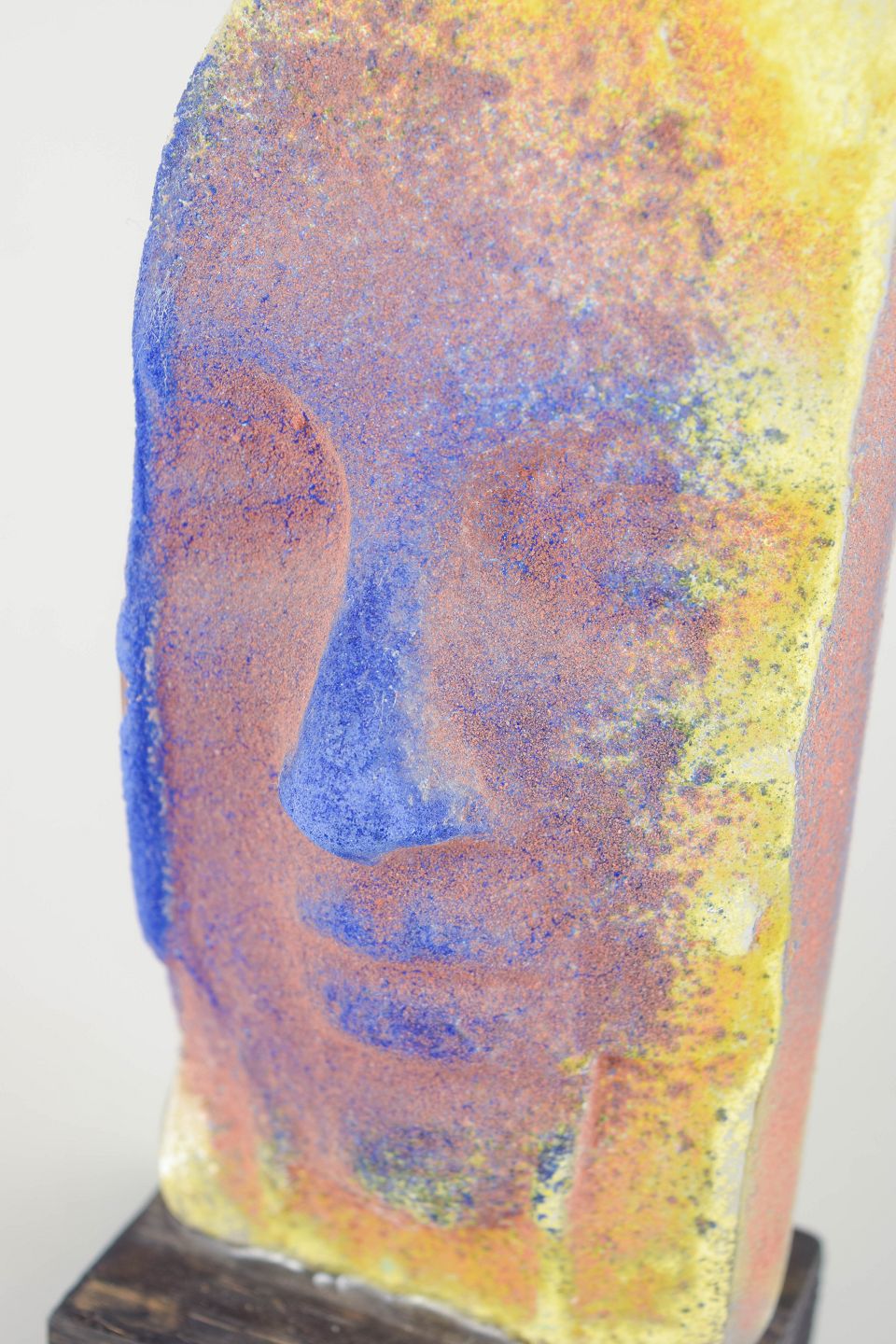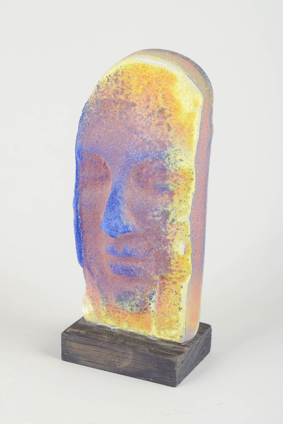 Svensk glaskunstskulptur med ansigtsmotiv i blå, gule og orange nuancer. Udført i støbt glas med en mat, krystallinsk overflade og monteret på sort træfod.