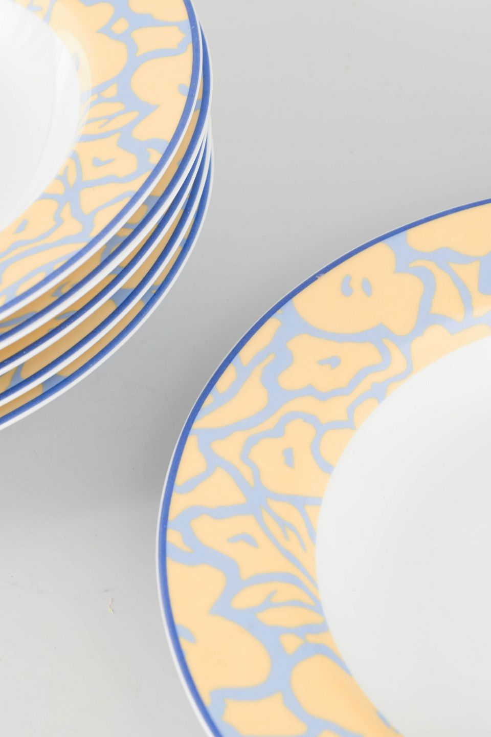 Porcelænstallerkener med karakteristisk bred gul kant med blå konturer i blomstermotiv, et eksempel på Graves’ postmoderne formsprog for Alessi i perioden.