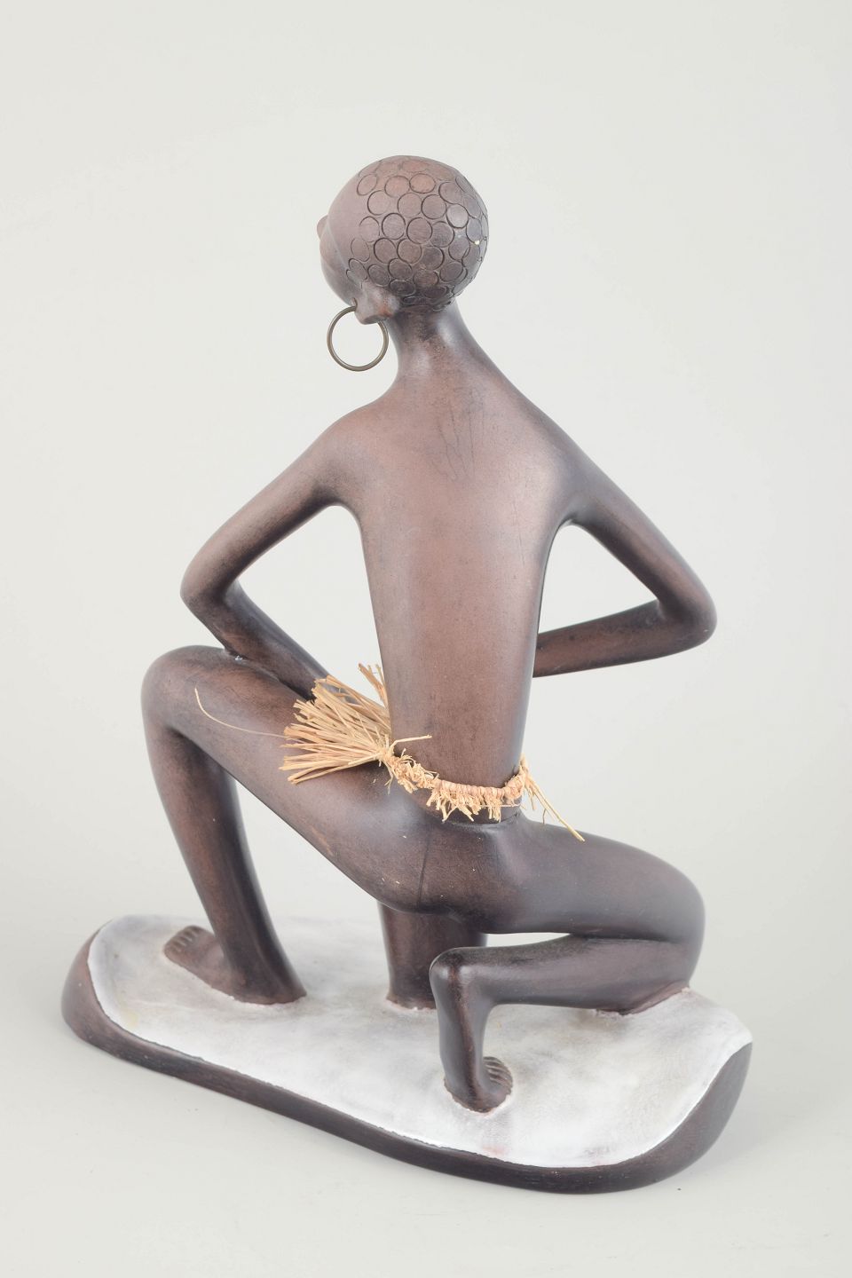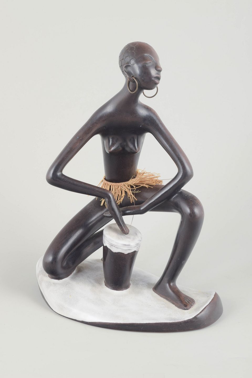 Stor keramisk figur af en kvinde, knælende med tromme, udført i brun glasur med hvidt underlag og stråskørt. Typisk for Anzengrubers eksotiserende figurer fra perioden.