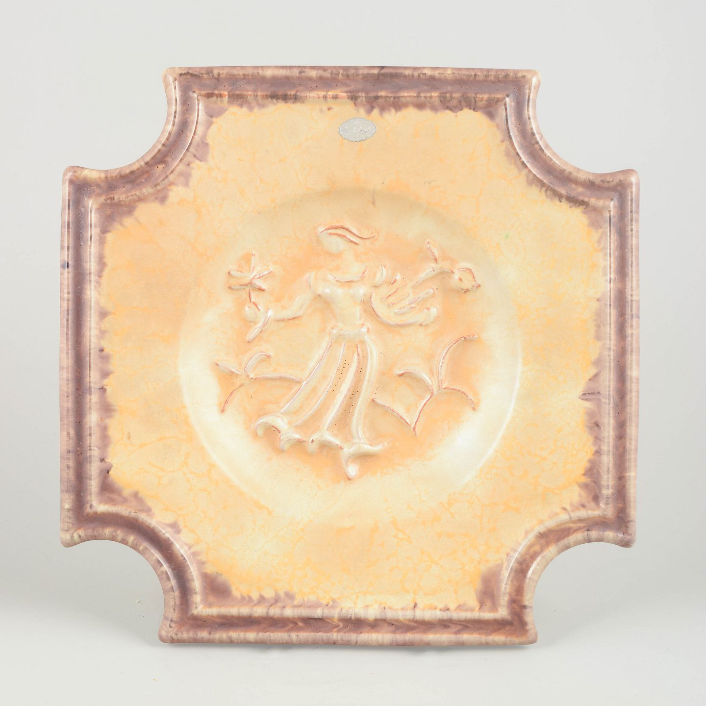 Kvadratisk keramisk fad med indpresset reliefmotiv af kvindefigur med blomster.