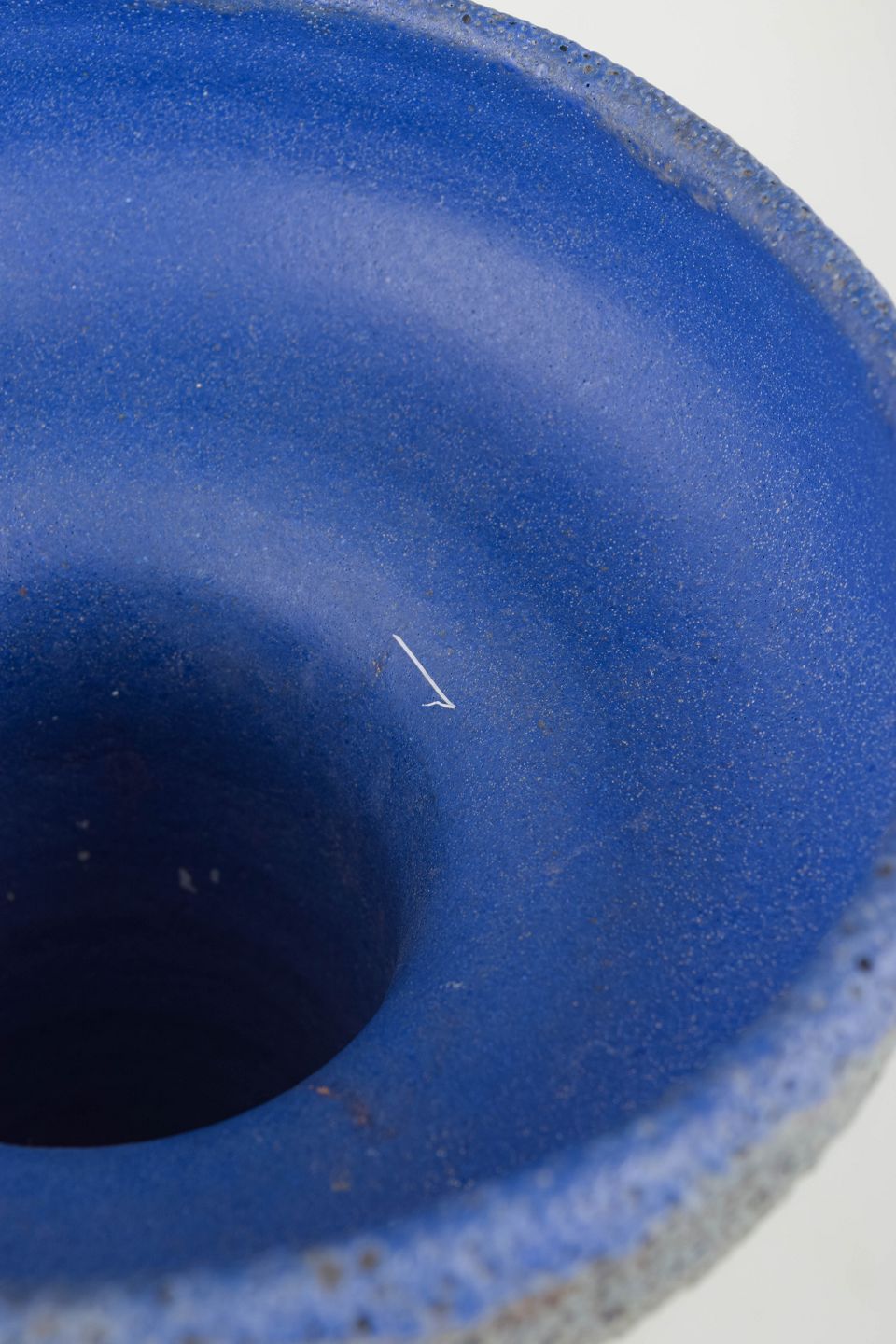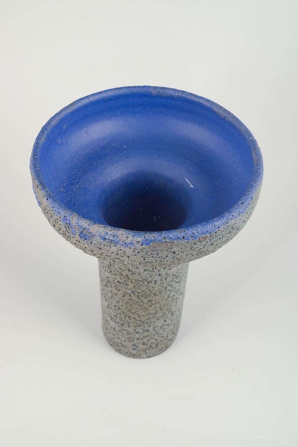 Håndlavet stentøjsvase med karakteristisk lava-glasur overflade i gråtoner og kraftig, blank blå glasur indvendigt. Typisk for tysk studiokeramik fra 1970’erne med kontrast mellem rå tekstur og intens farve.