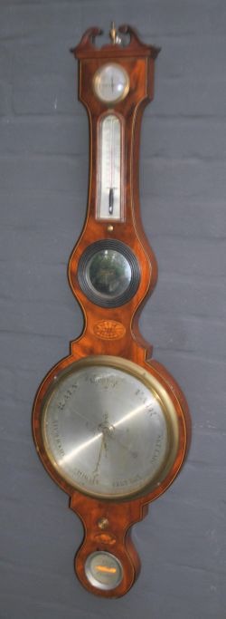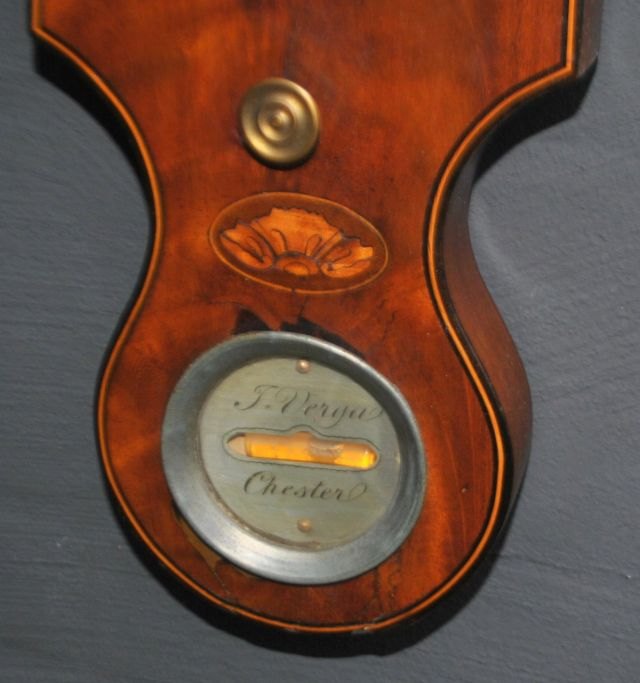 Engelsk hjul barometer.19. årh. J. Verga Chester. Georg III stil. Mahognikasse med intarsia. Signeret. L.: 110 cm. Dia. 31 cm.